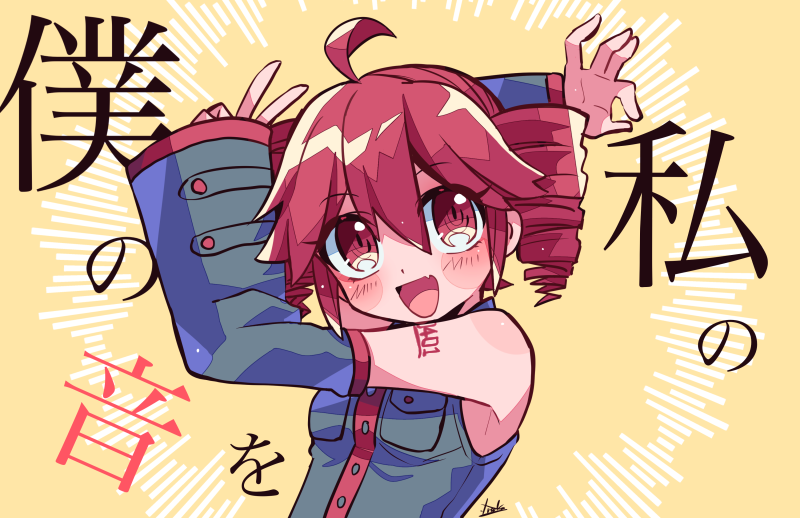 1girl ahoge arm_tattoo arms_up artist_name bare_shoulders breasts buttons collared_shirt commentary detached_sleeves drill_hair fang goodbye_sengen_(vocaloid) grey_shirt grey_sleeves hair_between_eyes kasane_teto kasane_teto_(utau) long_sleeves number_tattoo ok_sign open_mouth red_eyes red_hair red_trim shirt short_hair skin_fang sleeveless sleeveless_shirt small_breasts smile solo tattoo twin_drills utau v yellow_background yuusuke-kun