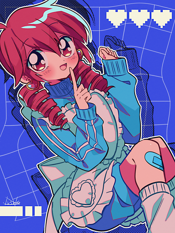 1990s_(style) 1girl ahoge alternate_costume alternate_hairstyle apron aqua_shorts aqua_sweater artist_name back_bow bandaid bandaid_on_leg blue_background bow clenched_hand drill_hair earrings hair_between_eyes heart heart_earrings jewelry kasane_teto knees_up leg_warmers looking_at_viewer low_drills maid medium_hair open_mouth pointing pointing_at_self red_eyes red_hair retro_artstyle shorts sitting smile solo sweater turtleneck turtleneck_sweater twin_drills unconventional_maid utau white_apron white_bow white_leg_warmers white_trim yuusuke-kun