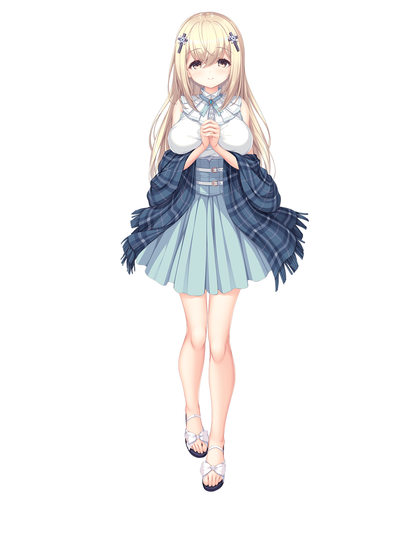 1girl blonde_hair breasts cross_hair_ornament dress facing_viewer full_body hair_ornament hajimeru_sekai_no_risouron highres interlocked_fingers large_breasts long_hair looking_at_viewer mikagami_mamizu non-web_source official_art own_hands_together photoshop_(medium) plaid_clothes sandals short_dress smile solo tachi-e tier_fallentite transparent_background yellow_eyes