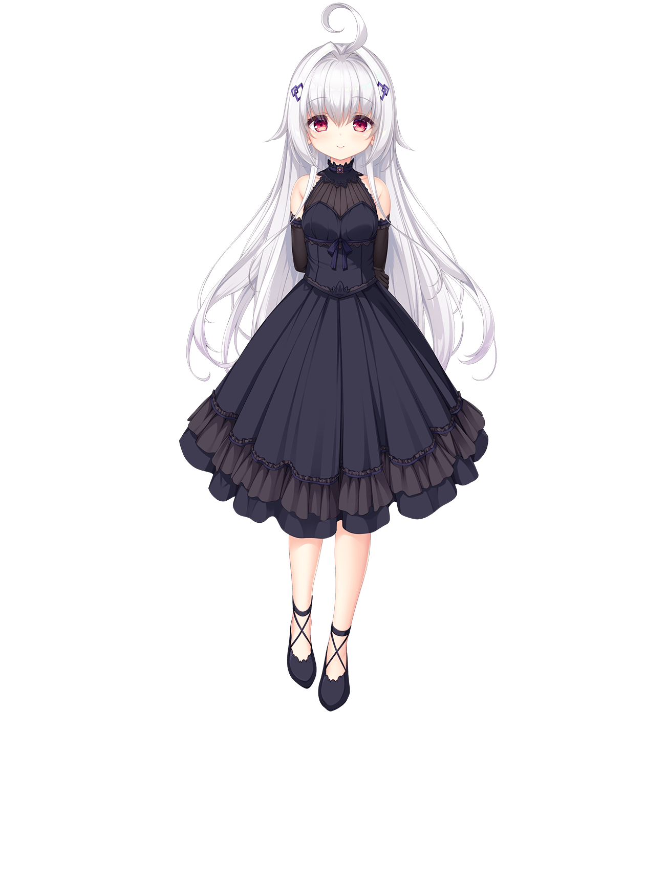 1girl ahoge black_dress black_footwear black_gloves dress elbow_gloves full_body gloves hair_intakes hajimeru_sekai_no_risouron highres long_hair looking_at_viewer mikagami_mamizu non-web_source official_art photoshop_(medium) red_eyes smile solo white_hair yoru_(hajimeru_sekai_no_risouron)