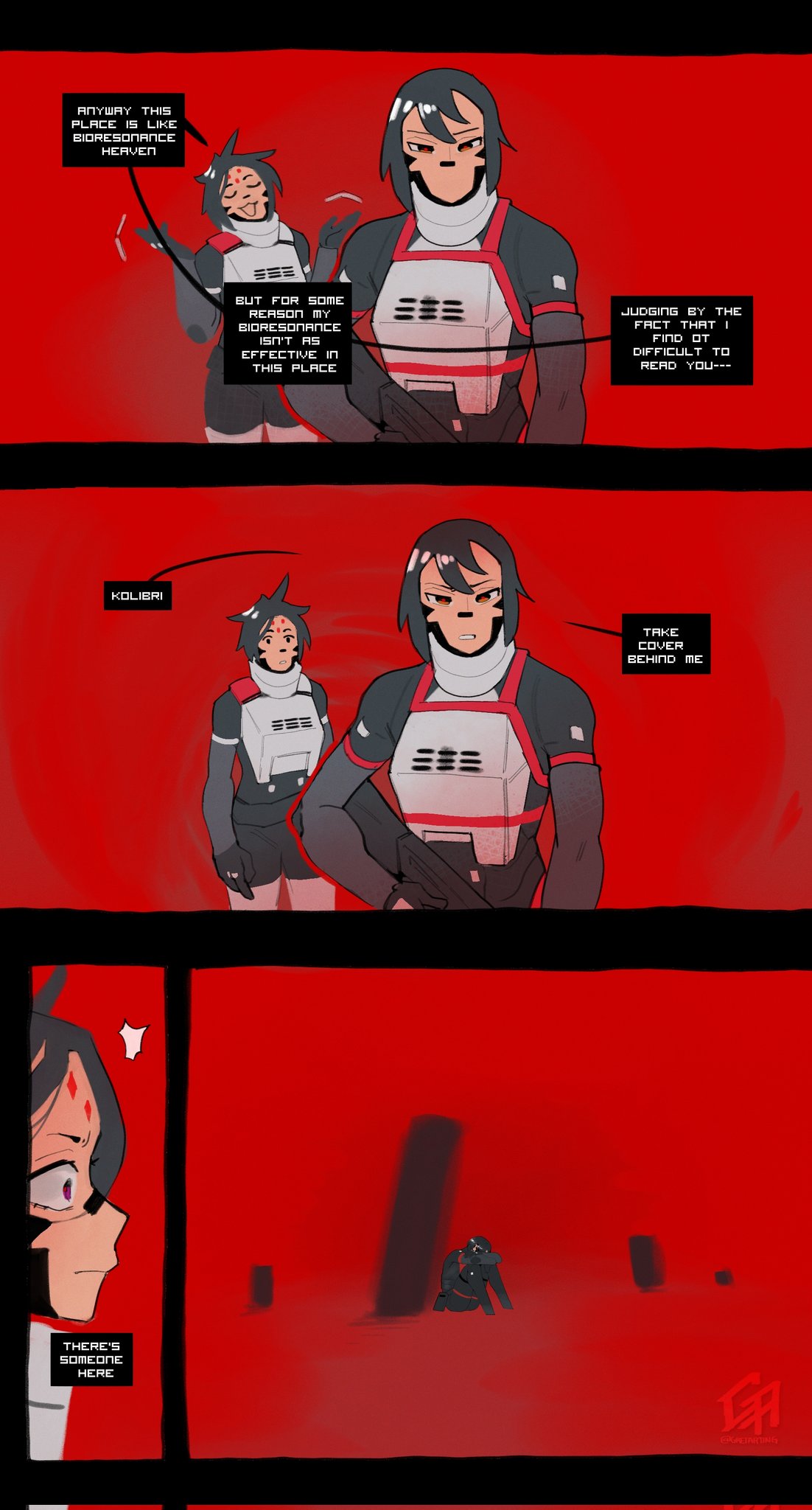 3girls android armor corrupted_twitter_file cyberpunk elster_(signalis) english_text gretarting gun height_difference highres holding holding_gun holding_weapon horror_(theme) kolibri_(signalis) multiple_girls pump_action red_theme science_fiction shotgun signalis storch_(signalis) weapon