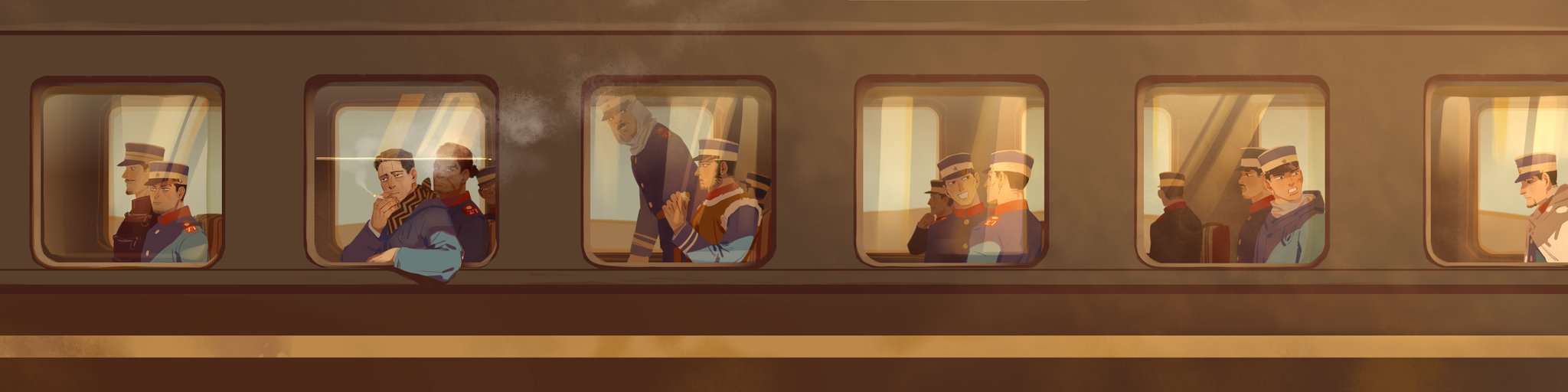 6+boys beard beard_stubble blue_jacket brown_background brown_hair character_request chengongzi123 cigarette closed_mouth facial_hair goatee golden_kamuy hand_up hat headscarf highres holding holding_cigarette jacket kazuo_maeyama kikuta_mokutaro long_image long_sleeves looking_at_another looking_at_viewer looking_to_the_side male_focus military_hat military_uniform multiple_boys mustache nikaidou_kouhei nikaidou_youhei ogata_hyakunosuke open_mouth open_window rikimatsu_ariko scar scar_on_face short_hair sideburns sitting smoking standing stubble tanigaki_genjirou train tsukishima_hajime tsurumi_tokushirou upper_body very_short_hair wide_image window