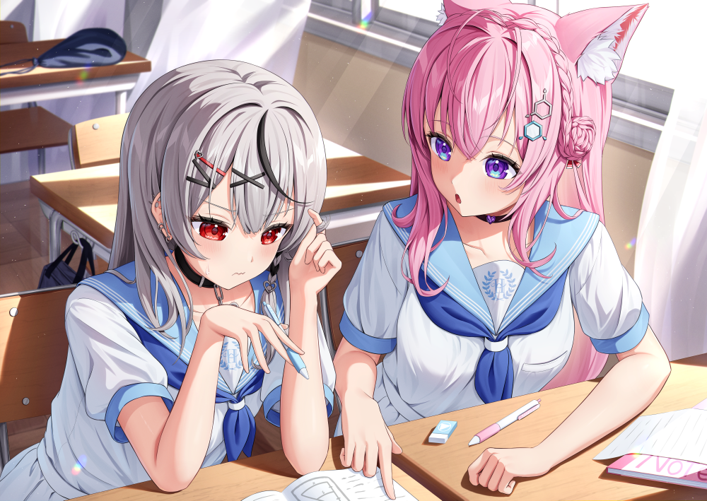2girls animal_ear_fluff animal_ears antenna_hair belt black_choker black_hair blue_sailor_collar choker desk grey_hair hair_ornament hairpin hakui_koyori holding holding_pen holohoneygaoka_high_school_uniform holohoneygaoka_koukou hololive honeyworks kag_tsukimi long_hair multicolored_hair multiple_girls pen pink_hair purple_eyes red_eyes sailor_collar sakamata_chloe school_desk school_uniform shirt skirt streaked_hair virtual_youtuber white_belt white_shirt white_skirt wolf_ears wolf_girl x_hair_ornament