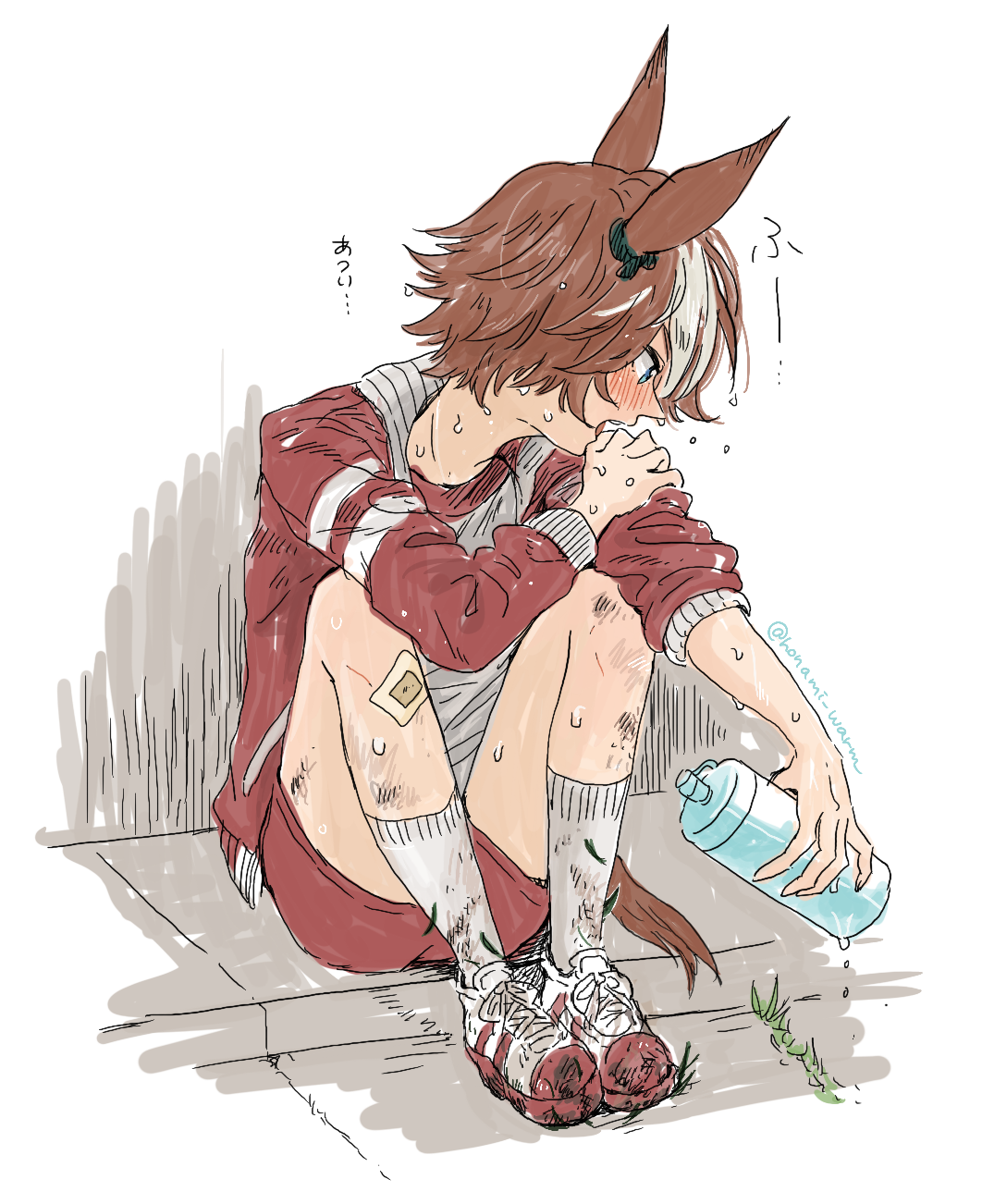 1girl animal_ears bamboo_memory_(umamusume) bandaid bandaid_on_leg blue_eyes blush bottle brown_hair dirty dirty_clothes gym_uniform heavy_breathing highres holding holding_bottle horse_ears horse_girl horse_tail inaho_soji jacket knees_up looking_to_the_side multicolored_hair open_clothes open_jacket open_mouth red_jacket red_shorts shirt shoes short_hair shorts sitting sneakers socks solo streaked_hair sweat tail umamusume very_sweaty water_bottle white_shirt white_socks