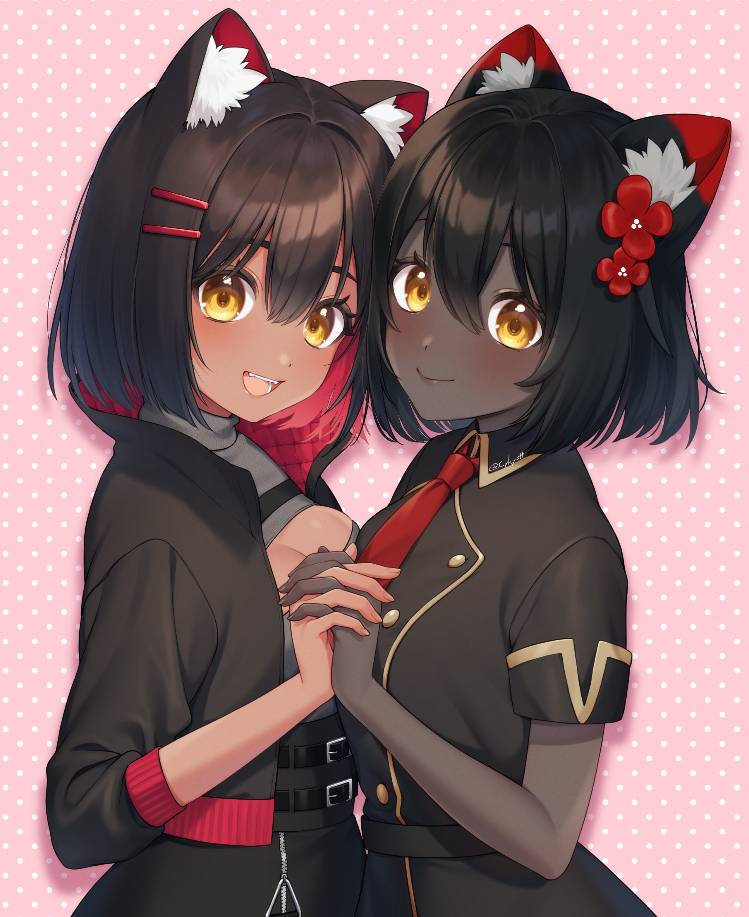 2girls absurdres animal_ear_fluff animal_ears black_hair black_jacket black_shirt blush breasts closed_mouth dark-skinned_female dark_skin flower hair_between_eyes hair_flower hair_ornament hairclip highres indie_virtual_youtuber jacket looking_at_viewer medium_breasts multiple_girls open_mouth pink_background sakura_chiyo_(konachi000) sakuraba_chiyo shirt short_hair smile very_dark_skin virtual_youtuber yellow_eyes
