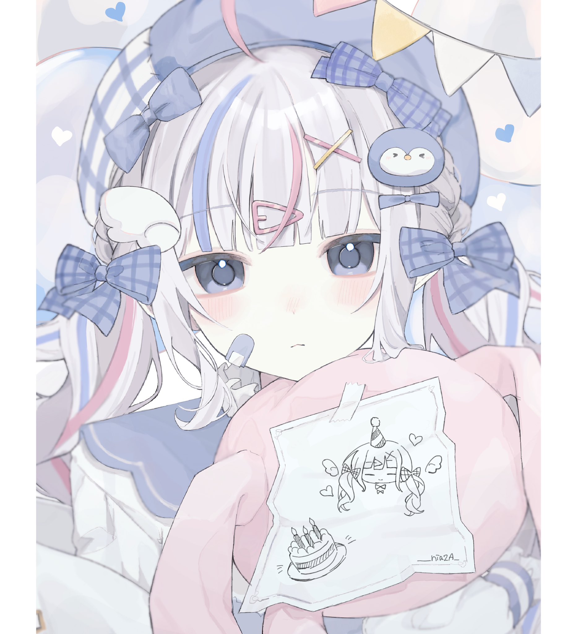 1girl ahoge bandaid bandaid_on_face beret birthday_cake blue_bow blue_eyes blue_hair blue_hat blush bow cake closed_mouth drawing_(object) food grey_hair hair_bow hair_ornament hat heart highres hugging_object indie_virtual_youtuber long_hair long_sleeves looking_at_viewer multicolored_hair niaa paper penguin_hair_ornament pink_hair sango_(35sangosan)_(vtuber) solo streaked_hair string_of_flags stuffed_animal stuffed_rabbit stuffed_toy twintails upper_body virtual_youtuber wing_hair_ornament x_hair_ornament