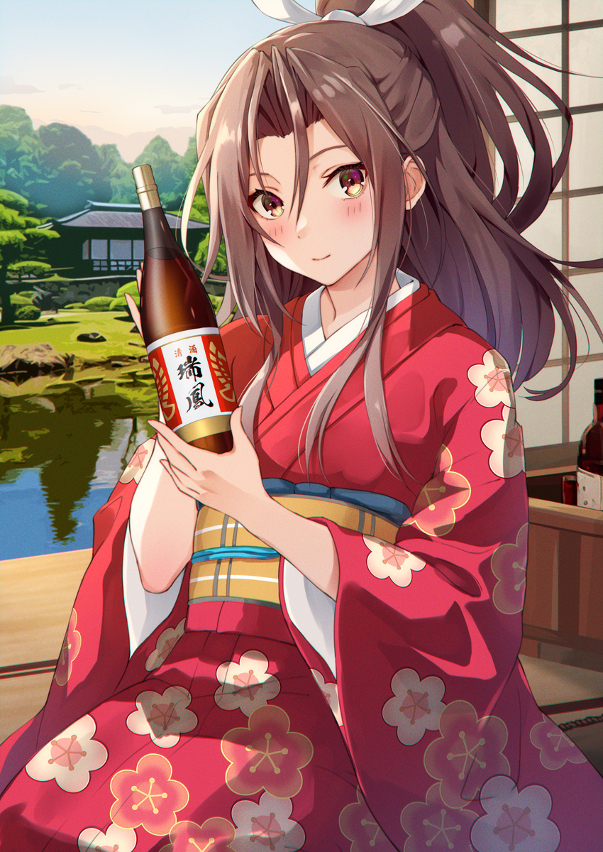 1girl architecture bottle brown_eyes brown_hair building commission day east_asian_architecture floral_print floral_print_kimono furisode hair_ribbon high_ponytail highres holding holding_bottle japanese_clothes kanden_sky kantai_collection kimono looking_at_viewer obi pixiv_commission pond ponytail print_kimono red_kimono ribbon sash shouji sitting sliding_doors smile solo white_ribbon wide_sleeves wooden_floor zuihou_(kancolle) zuihou_(new_year)_(kancolle) zuihou_kai_ni_(kancolle)