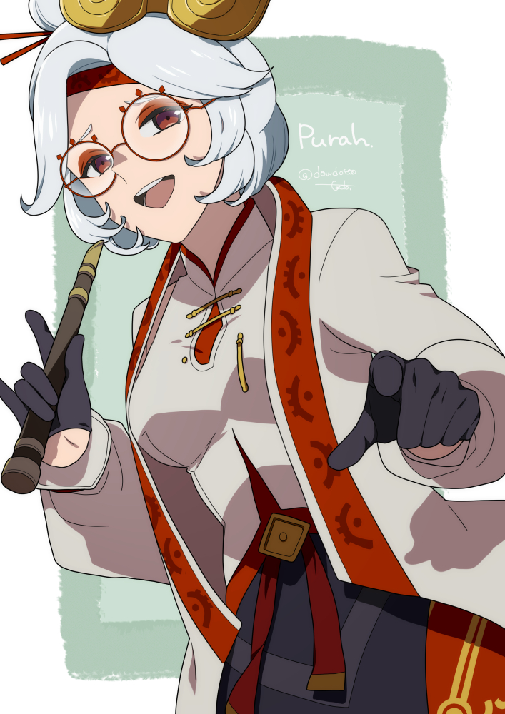 1girl black_gloves breasts eyeshadow eyewear_on_head glasses gloves hair_bun hair_ornament hair_stick headband makeup medium_breasts nintendo pantyhose purah red-framed_eyewear red_eyes red_eyeshadow red_headband red_pantyhose round_eyewear sheikah short_hair solo the_legend_of_zelda the_legend_of_zelda:_tears_of_the_kingdom todono_tumari updo white_hair