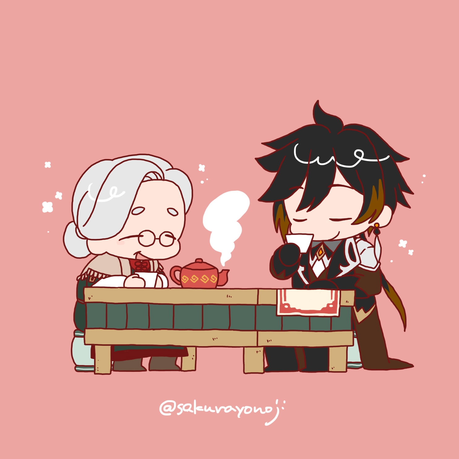 1boy 1girl brown_hair chibi closed_eyes cup drinking earrings genshin_impact glasses grey_hair hair_bun highres holding holding_cup jewelry long_hair madame_ping_(genshin_impact) pink_background sakurayonoji simple_background sitting sparkle steam table tea teapot zhongli_(genshin_impact)