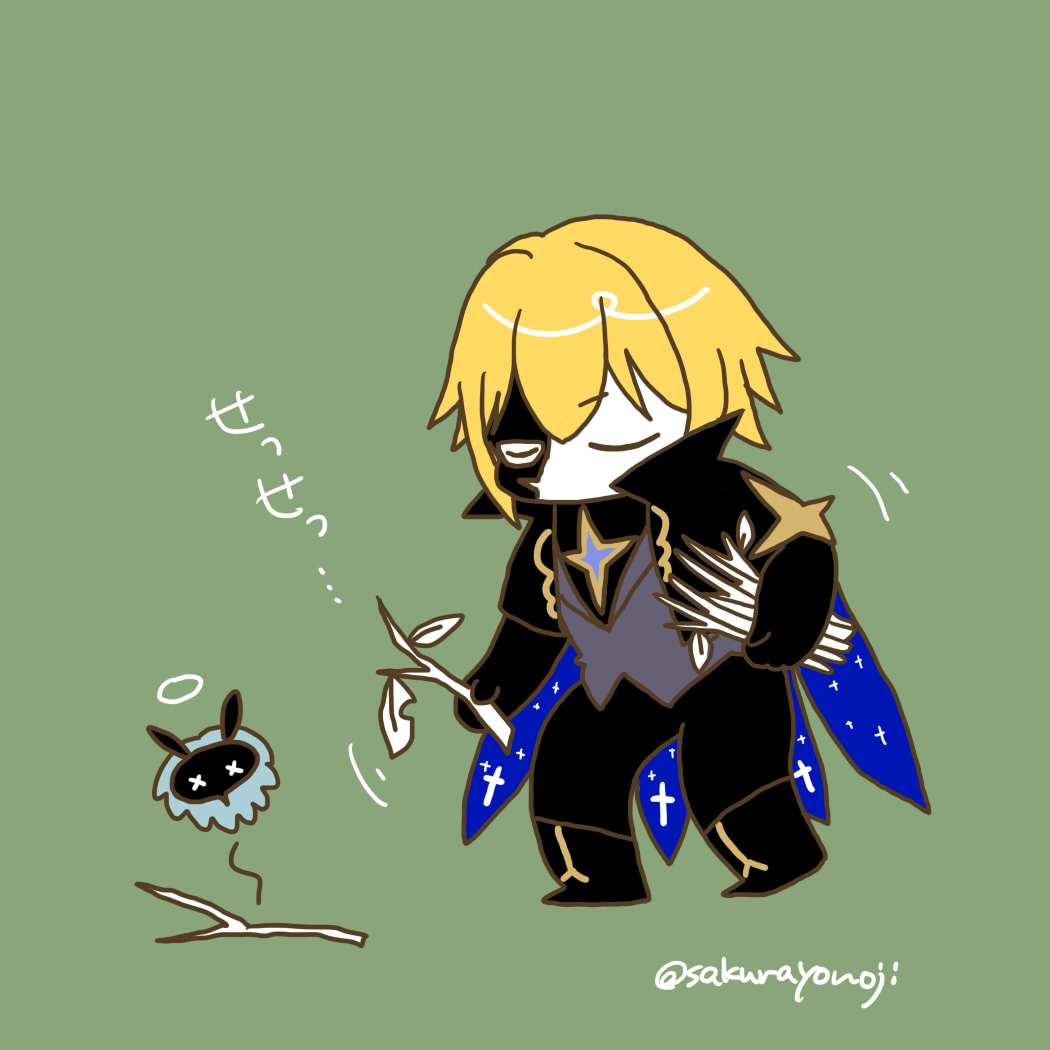 1boy abyss_mage_(genshin_impact) closed_eyes dainsleif_(genshin_impact) full_body genshin_impact green_background halo male_focus mask sakurayonoji short_hair simple_background solo x_x