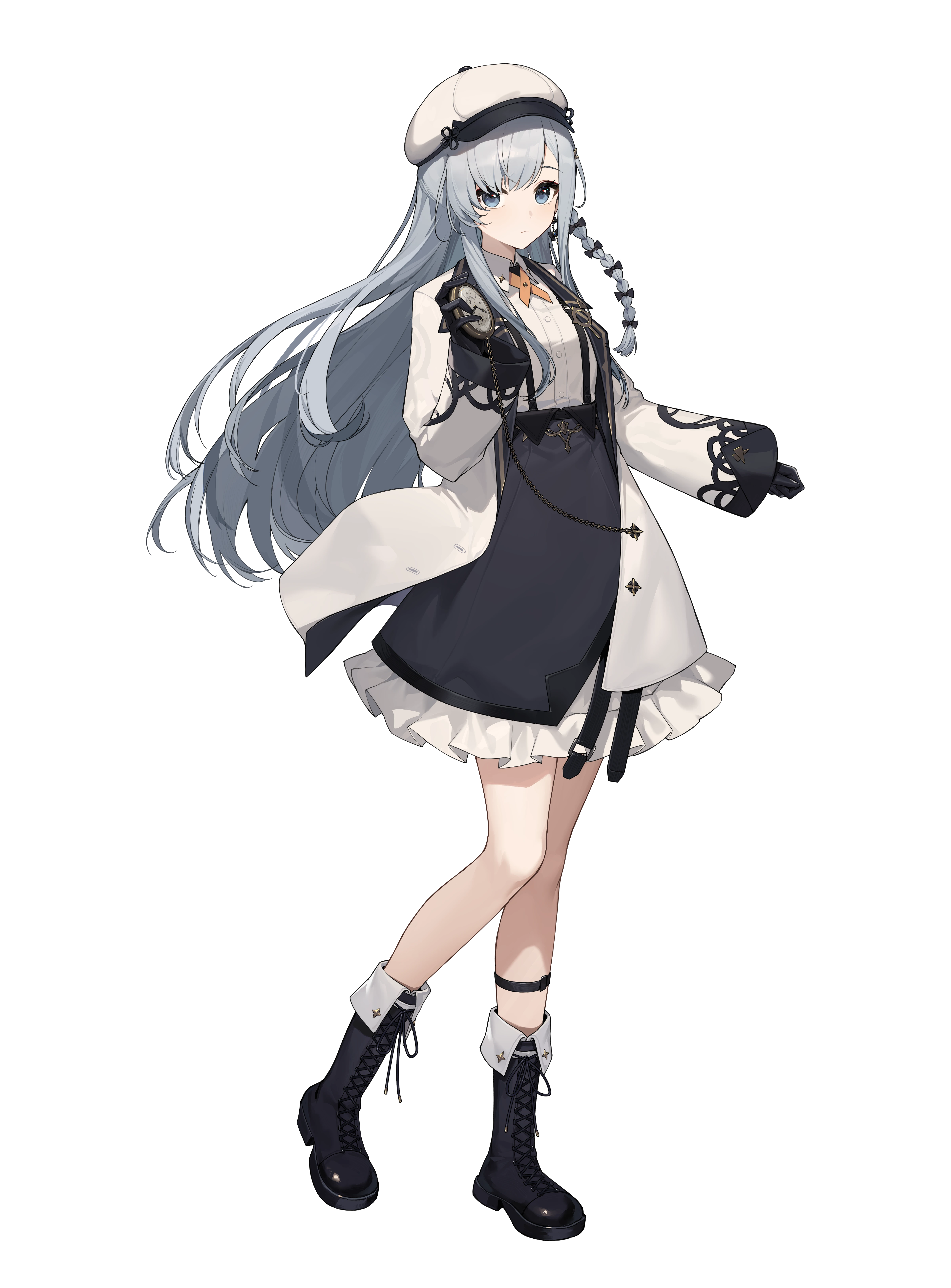 1girl absurdres black_boots black_gloves black_skirt boots braid newsboy_cap closed_mouth coat collared_shirt cross_tie dress_shirt fold-over_boots frilled_skirt frills full_body gloves grey_eyes grey_hair hand_up hat high-waist_skirt highres holding holding_pocket_watch knee_boots lace-up_boots lapels leg_belt long_hair looking_at_viewer miniskirt nagisa_(virtuareal) nijisanji official_art open_clothes open_coat pocket_watch shirt side_braid sidelocks skirt solo standing standing_on_one_leg suspender_skirt suspenders tachi-e three-quarter_sleeves transparent_background virtual_youtuber virtuareal watch white_coat white_hair white_shirt