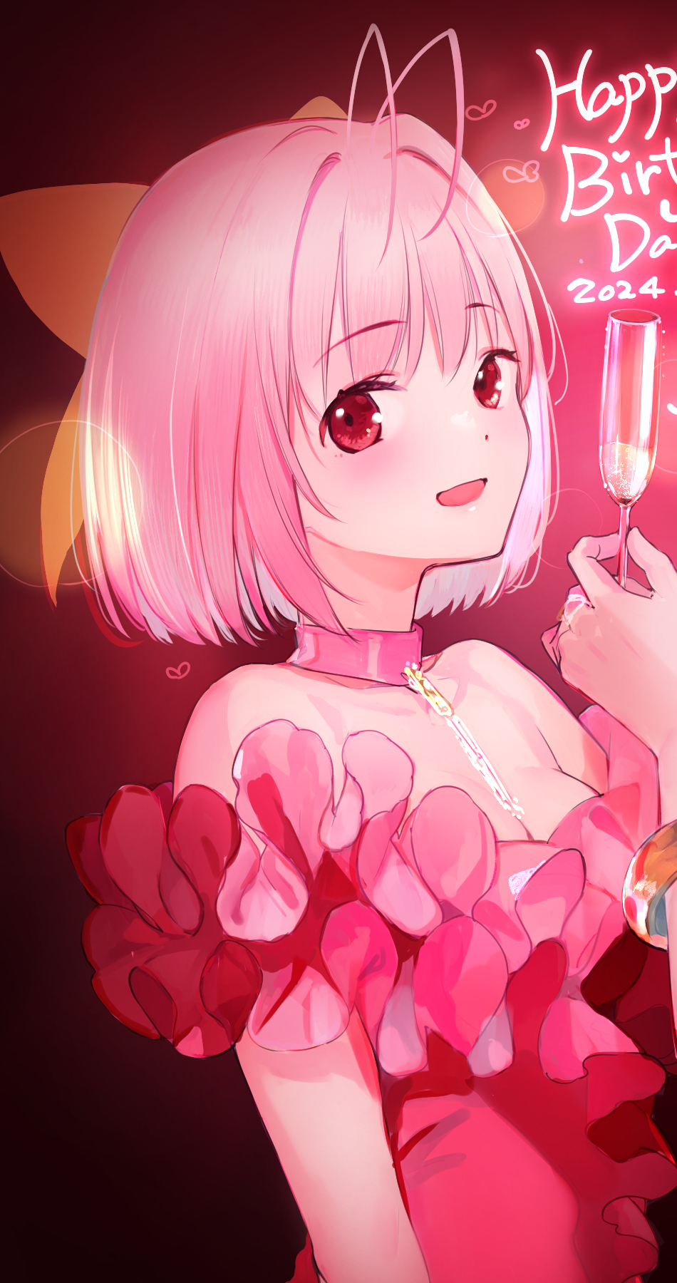 1girl 2024 antenna_hair bow breasts cleavage cup dress glass hair_bow happy_birthday highres holding holding_cup kami_nomi_zo_shiru_sekai medium_breasts nakagawa_kanon necktie open_mouth pink_dress pink_eyes pink_hair pyon-kichi ribbon short_hair smile solo
