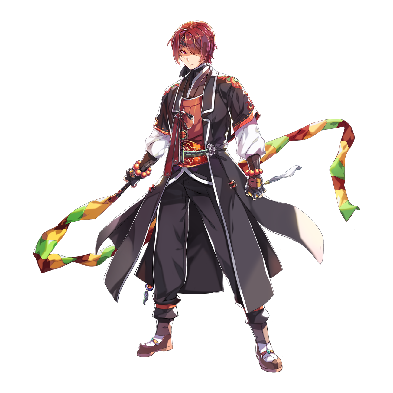 1boy bead_bracelet beads belt black_coat black_gloves black_pants black_shirt bracelet brown_shoes championship_belt clenched_hands closed_mouth coat fingerless_gloves frown full_body gloves hair_between_eyes hair_over_one_eye highres holding jewelry leona_(pixiv) long_bangs looking_at_viewer male_focus official_art open_clothes open_coat pants ragnarok_online red_eyes red_hair red_vest shaded_face shirt shoes short_hair simple_background solo soul_reaper_(ragnarok_online) standing tachi-e transparent_background vest
