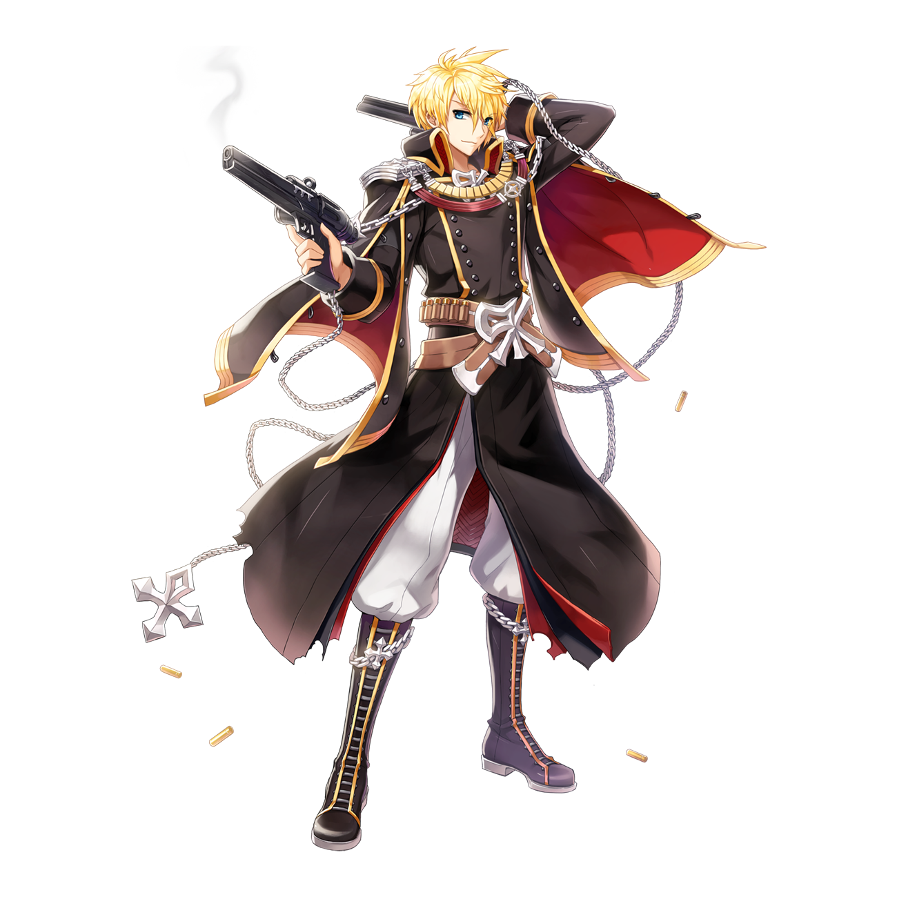 1boy arm_up bandolier belt black_boots black_coat blonde_hair blue_eyes boots brown_belt buttons chain closed_mouth coat cross double-breasted dual_wielding emblem epaulettes full_body gold_trim gun hair_between_eyes handgun highres holding holding_gun holding_weapon leona_(pixiv) long_bangs long_sleeves looking_at_viewer male_focus military_uniform official_art pants pants_tucked_in ragnarok_online rebellion_(ragnarok_online) revolver shell_casing short_hair simple_background smile solo standing tachi-e transparent_background weapon white_pants
