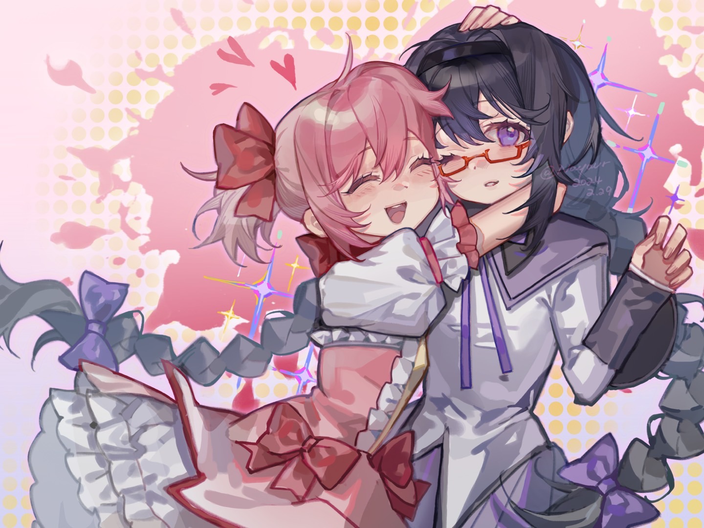 2girls ^_^ ahoge akemi_homura akemi_homura_(magical_girl) black_hair black_hairband bow braid bubble_skirt capelet cheek-to-cheek chinese_commentary closed_eyes commentary_request cowboy_shot dotted_background dress dress_bow facing_viewer floating_hair frilled_dress frilled_skirt frills glasses hair_bow hairband hand_on_another's_head hand_up happy heads_together heart hug jacket kaname_madoka kaname_madoka_(magical_girl) long_hair long_sleeves looking_at_viewer mahou_shoujo_madoka_magica mahou_shoujo_madoka_magica_(anime) multicolored_background multiple_girls neck_ribbon one_eye_closed open_mouth pink_dress pink_hair puffy_short_sleeves puffy_sleeves purple_capelet purple_eyes purple_skirt red-framed_eyewear red_bow ribbon shixiaoqina short_hair short_sleeves short_twintails skirt smile sparkle standing twin_braids twintails white_jacket white_skirt
