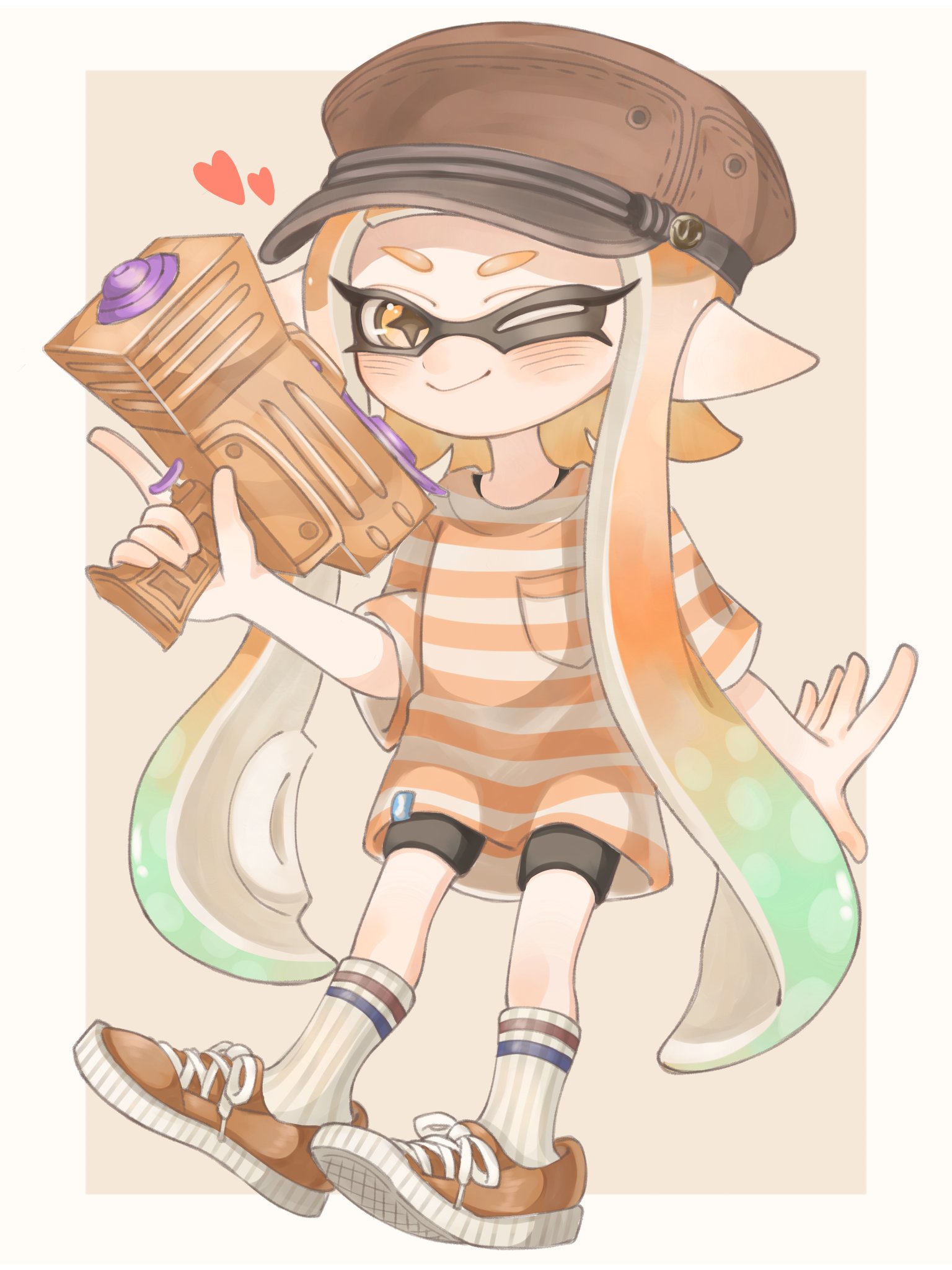 1girl black_shorts border brown_hat brown_shoes closed_mouth commentary cross-laced_footwear eyelashes full_body gradient_hair green_hair grey_background gun hat heart highres holding holding_gun holding_weapon inkling inkling_girl inkling_player_character lemo_(lemo_4) long_hair multicolored_hair nintendo one_eye_closed orange_eyes orange_hair orange_shirt outside_border pointy_ears shirt shoes shorts simple_background smile socks solo splatoon_(series) splattershot_jr._(splatoon) standing star-shaped_pupils star_(symbol) striped_clothes striped_shirt untranslatable_commentary symbol-shaped_pupils tentacle_hair two-tone_hair very_long_hair weapon white_border white_shirt white_socks
