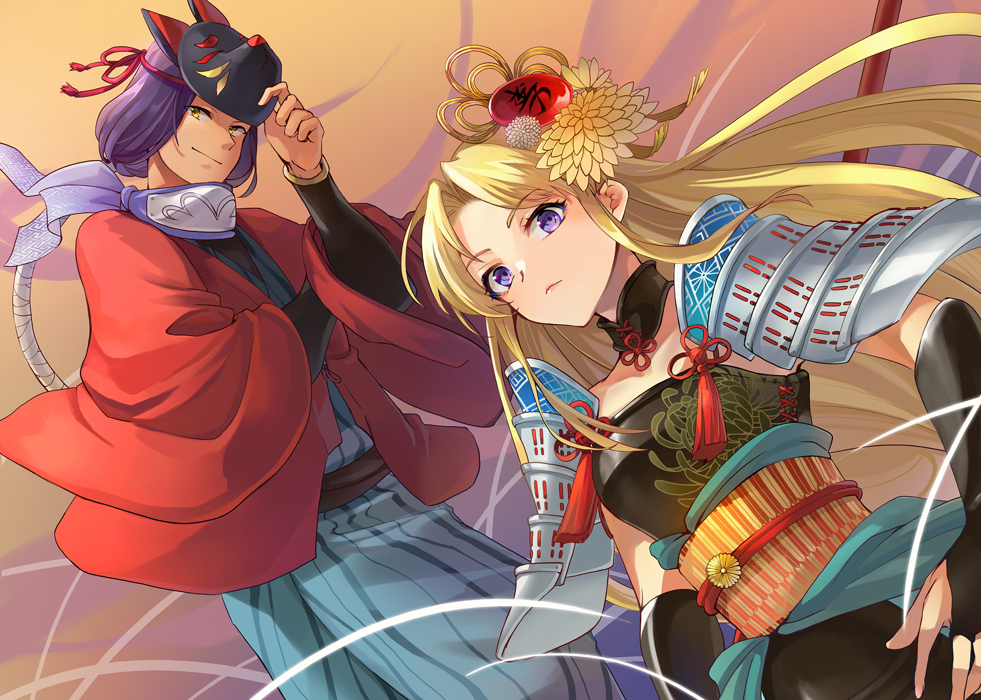 1boy 1girl alternate_costume artist_request blonde_hair blue_eyes closed_mouth expressionless hawkeye_(seiken_densetsu_3) highres japanese_clothes long_hair looking_at_viewer purple_hair riesz seiken_densetsu seiken_densetsu_3 smile square_enix yellow_eyes