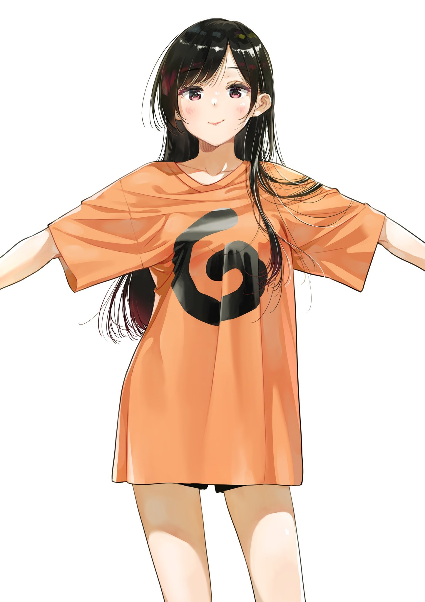 1girl black_hair blush brown_eyes closed_mouth commentary_request highres kanojo_okarishimasu long_hair looking_at_viewer miyajima_reiji mizuhara_chizuru orange_shirt oversized_clothes oversized_shirt parted_bangs shirt short_shorts short_sleeves shorts simple_background solo uzumaki_symbol white_background