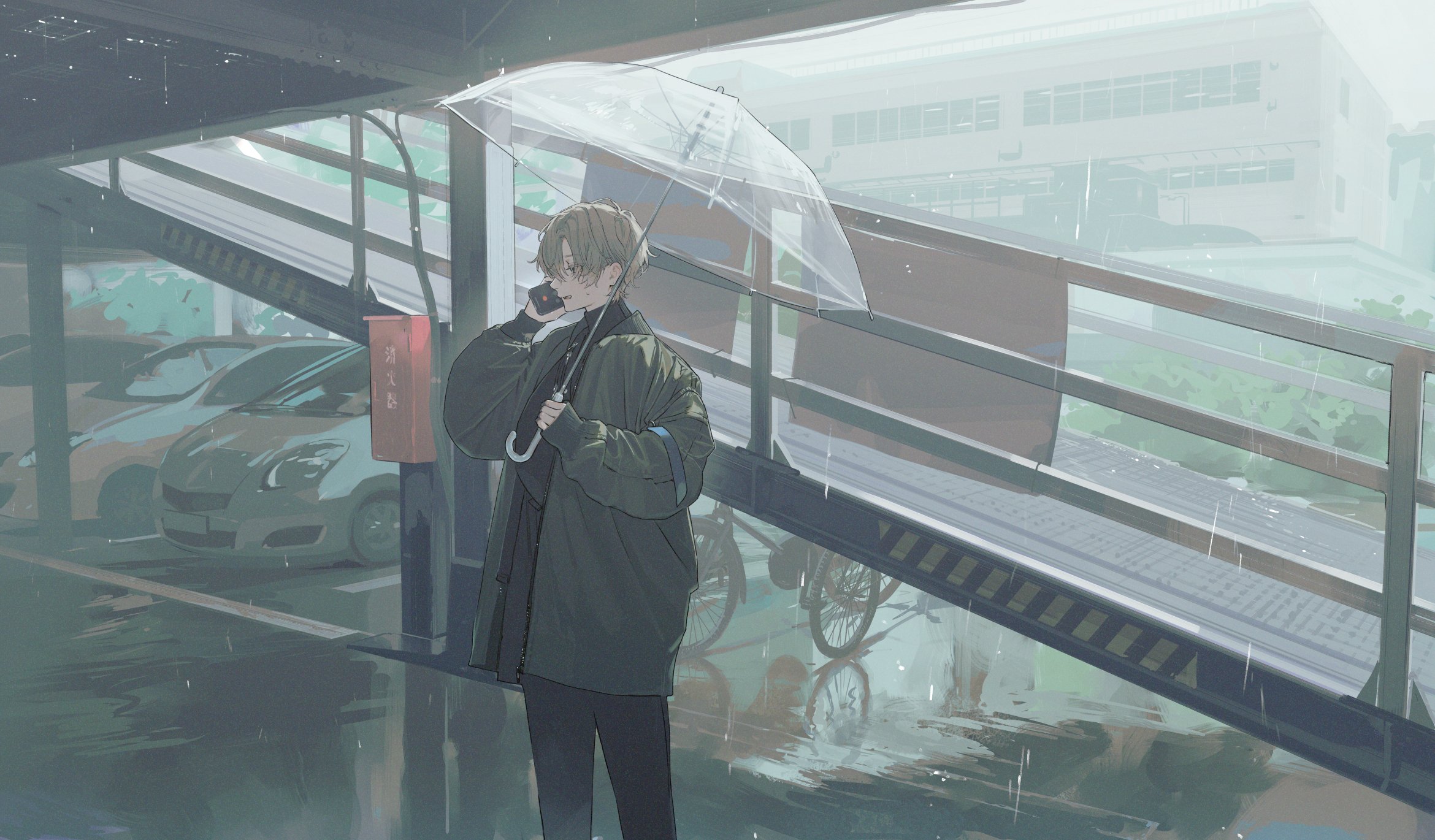 1boy bicycle black_pants brown_hair building car cellphone coat green_coat highres holding holding_phone holding_umbrella long_sleeves male_focus motor_vehicle orexxxo original outdoors overcast pants phone railing rain reflection reflective_floor shirt short_hair sky sleeves_past_wrists smartphone solo standing talking_on_phone transparent transparent_umbrella umbrella