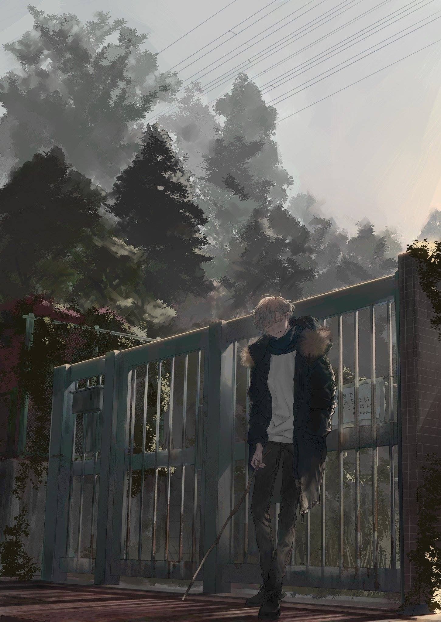 1boy bad_id bad_twitter_id black_footwear black_jacket black_pants blonde_hair closed_mouth full_body fur-trimmed_jacket fur_trim gate hand_in_pocket highres holding jacket long_sleeves looking_at_viewer male_focus orexxxo original outdoors pants pine_tree power_lines scarf shirt short_hair sign sky solo standing stick tree white_shirt