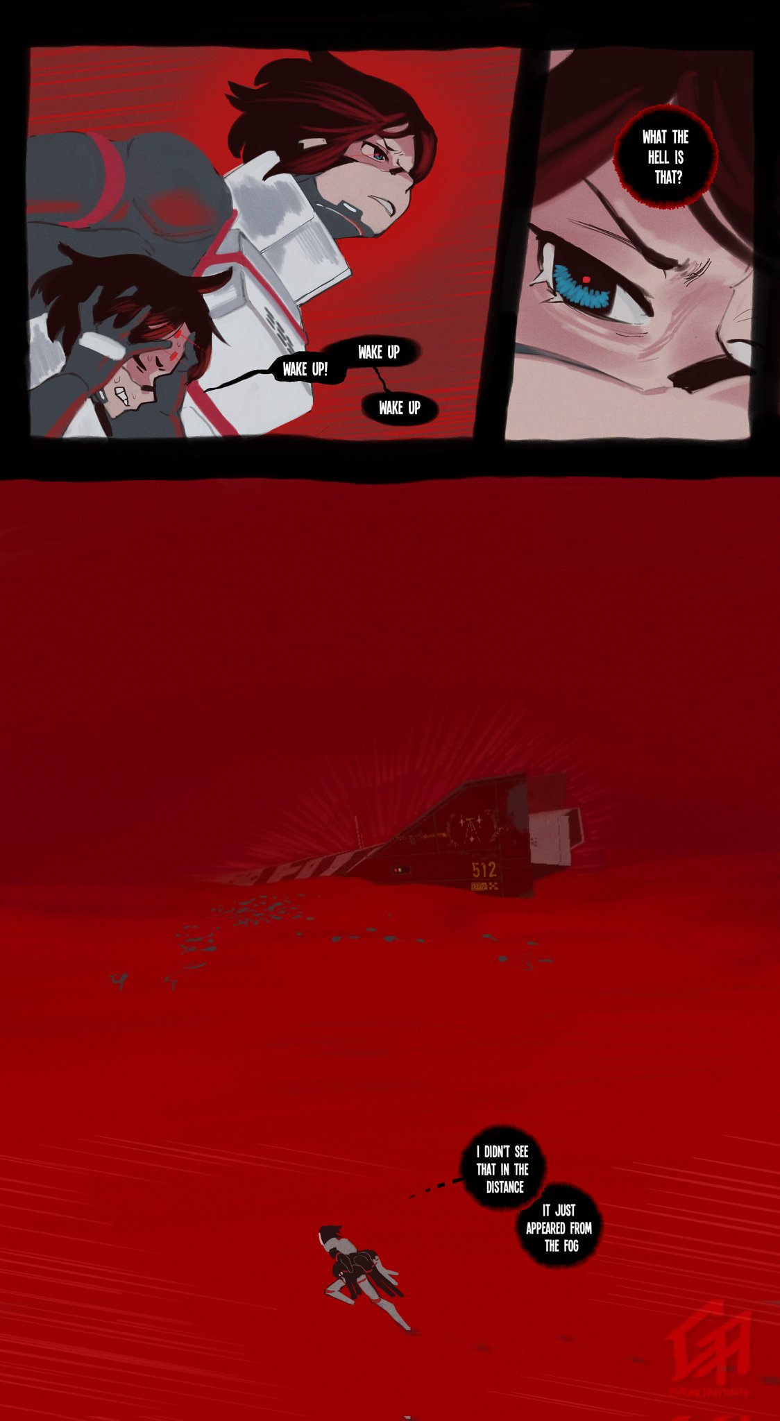 2girls android armor black_hair blue_eyes desert english_text facial_mark gretarting highres kolibri_(signalis) multiple_girls running short_hair signalis signature spacecraft speech_bubble storch_(signalis)