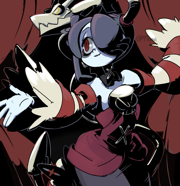 1girl 770mk blue_hair blue_skin colored_skin curtains detached_collar detached_sleeves dress outstretched_arms side_ponytail skullgirls smile solo squigly_(skullgirls) striped_sleeves zombie