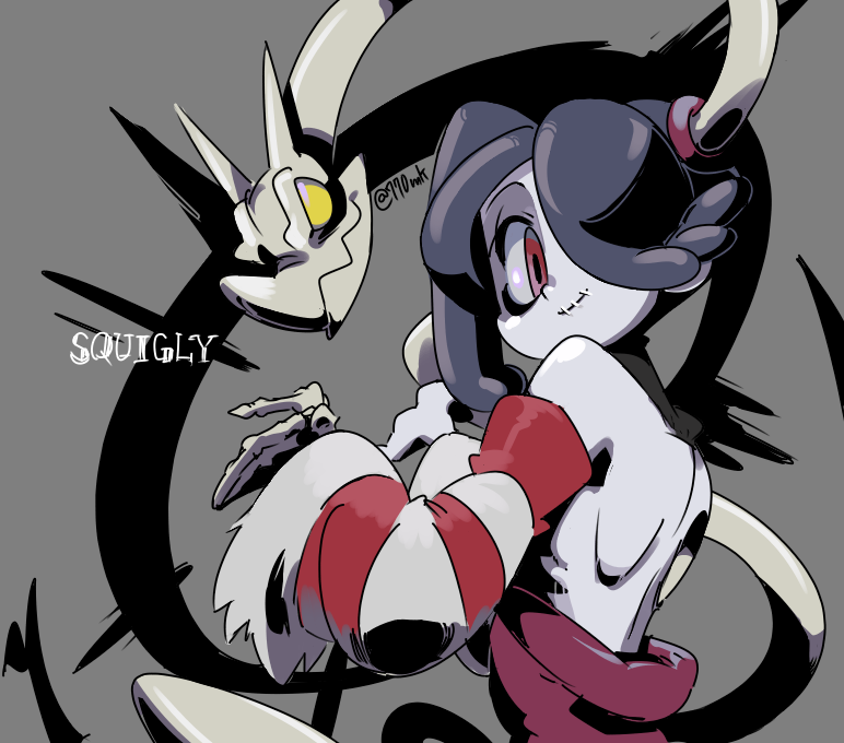 1girl 770mk blue_hair character_name colored_skin grey_background grey_skin looking_at_viewer looking_back shoulder_blades side_ponytail skeletal_arm skullgirls smile solo squigly_(skullgirls) stitched_mouth stitches striped_sleeves zombie