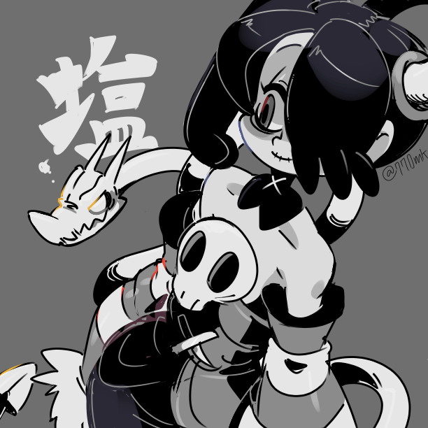 1girl 770mk detached_collar detached_sleeves dress grey_background greyscale hair_over_one_eye japanese_text monochrome side_ponytail skullgirls smile solo squigly_(skullgirls) stitched_mouth stitches striped_sleeves