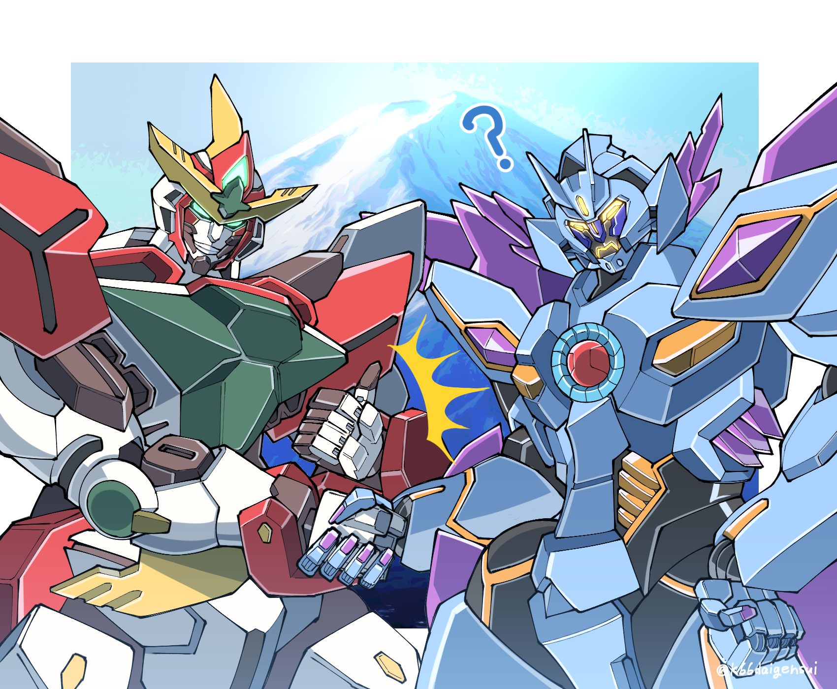 ? aqua_eyes artist_name bravern daigosan_(k66daigensui) hand_on_own_hip handshake highres mecha mountain robot superbia_(bravern) thumbs_up yellow_eyes yuuki_bakuhatsu_bang_bravern