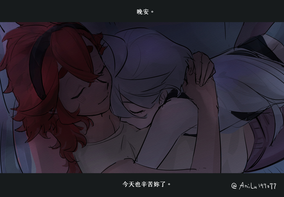 2girls ani_lu black_hairband black_shirt chinese_text closed_eyes closed_mouth commentary couch cuddling gundam gundam_suisei_no_majo hairband hand_on_another's_back holding letterboxed long_hair miorine_rembran multiple_girls night on_couch red_hair shirt sleeping sleeping_on_person sleeveless sleeveless_shirt subtitled suletta_mercury thick_eyebrows translation_request twitter_username white_hair white_shirt yuri
