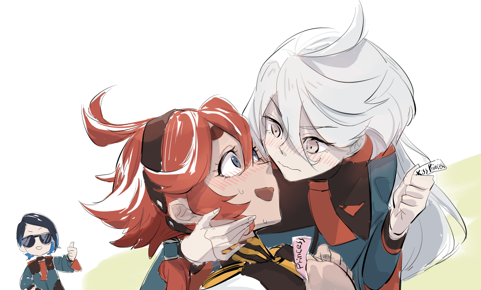 3girls ani_lu asticassia_school_uniform blue_eyes blue_hair blush closed_mouth commentary embarrassed eye_contact green_background green_jacket grey_eyes gundam gundam_suisei_no_majo hand_on_another's_face holding jacket long_hair long_sleeves looking_at_another miorine_rembran multicolored_hair multiple_girls necktie nika_nanaura open_mouth red_hair red_necktie school_uniform smile suletta_mercury sunglasses sweatdrop thick_eyebrows thumbs_up two-tone_background two-tone_hair white_background white_hair yuri