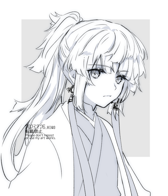 1girl aoiro_hiro closed_mouth dated earrings expressionless fate/samurai_remnant fate_(series) greyscale haori japanese_clothes jewelry kimono long_hair looking_at_viewer monochrome ponytail simple_background solo upper_body white_hair yui_shousetsu_(fate)