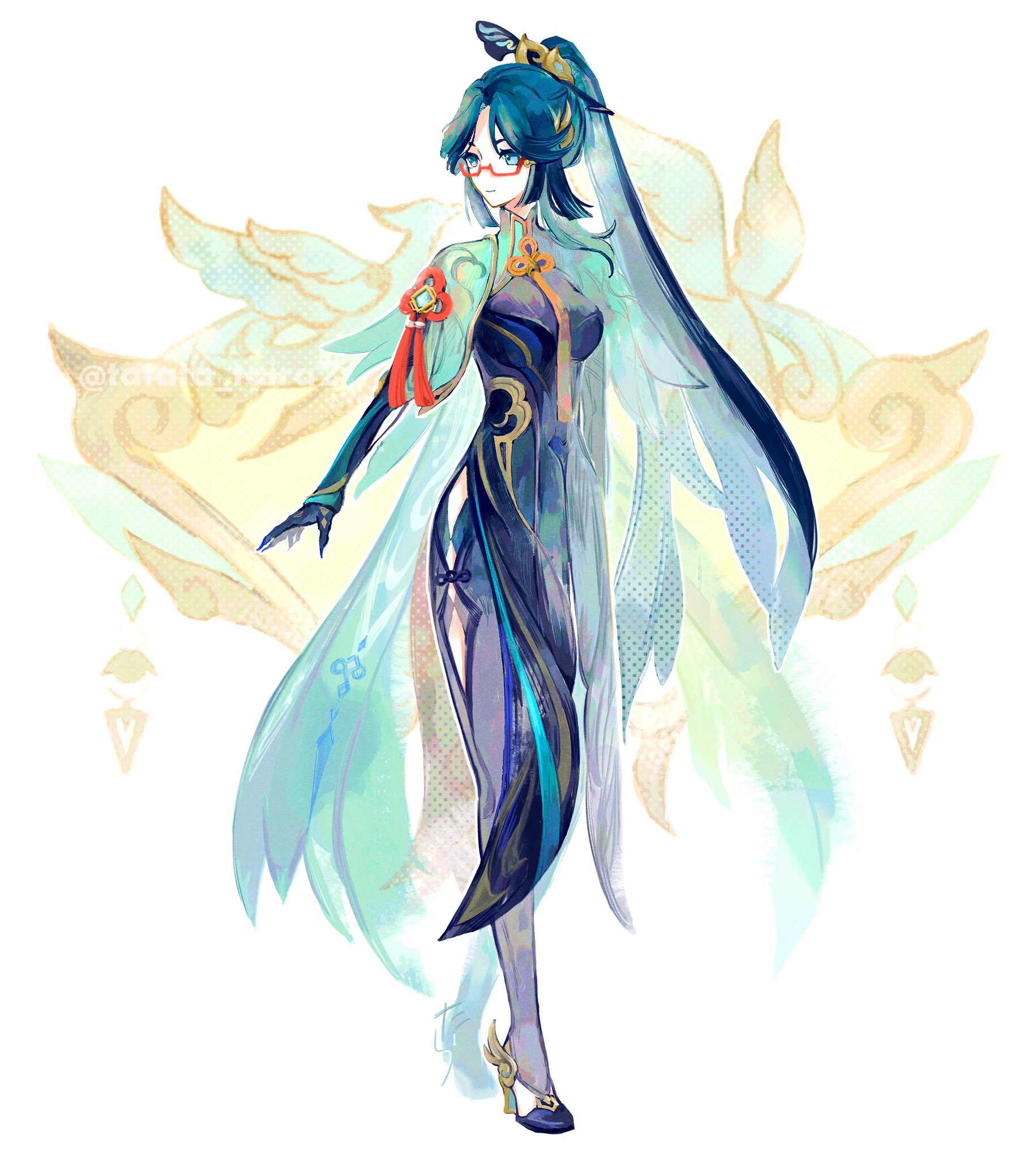 1girl black_dress black_pantyhose blue_eyes blue_hair breasts chinese_hairpin closed_mouth clothing_cutout dress full_body genshin_impact glasses hair_ornament highres large_breasts long_hair multicolored_hair pantyhose red-framed_eyewear simple_background solo standing tassel tatata_taira twitter_username very_long_hair white_background xianyun_(genshin_impact)