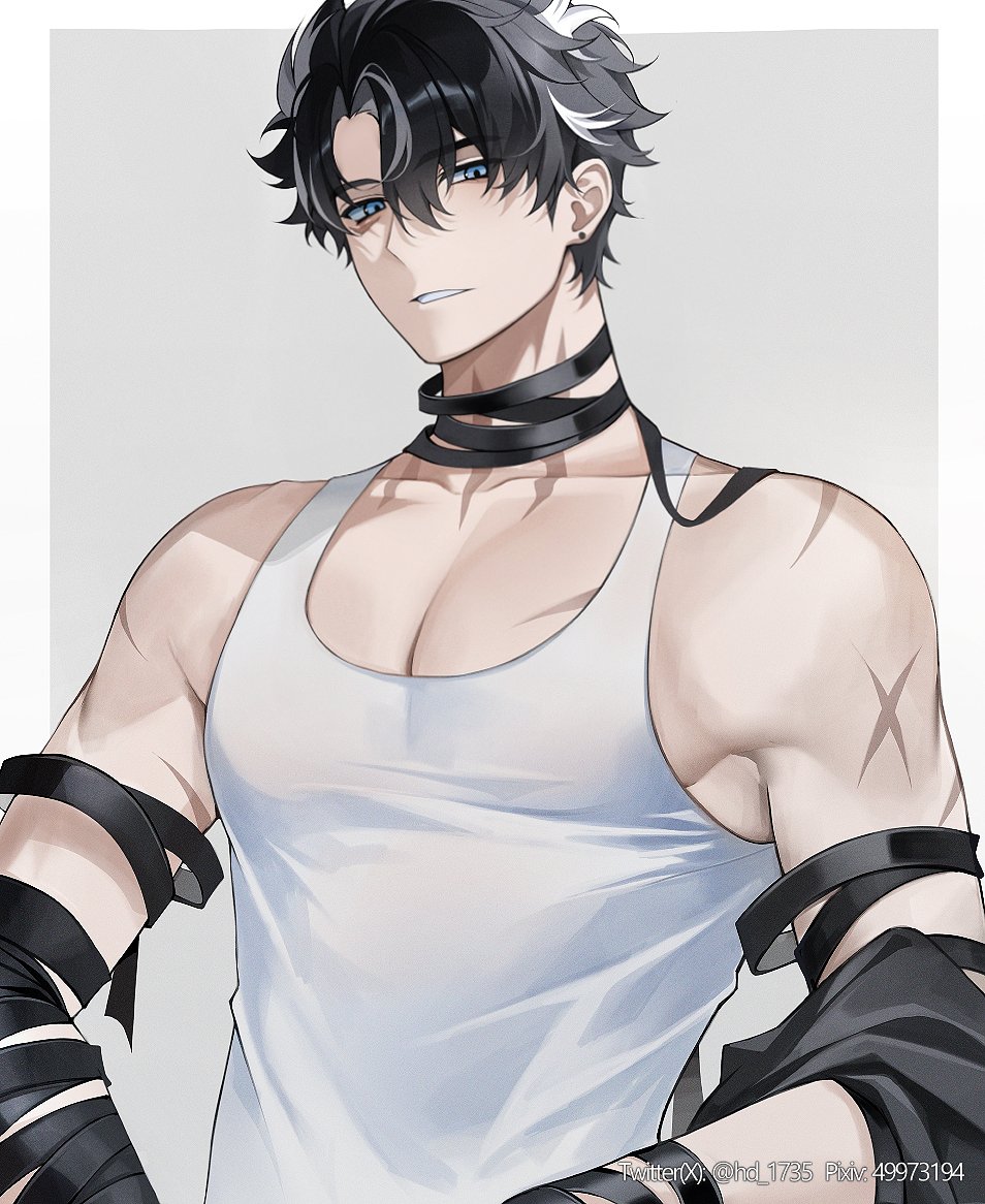 1boy abs bandages black_hair blue_eyes earrings genshin_impact grey_hair hair_between_eyes jewelry male_focus multicolored_hair muscular muscular_male scar short_hair solcha solo streaked_hair tank_top teeth white_tank_top wriothesley_(genshin_impact)