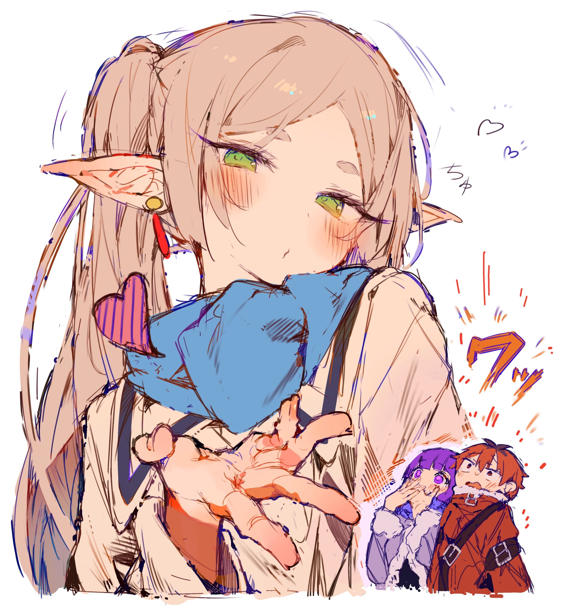 1boy 2girls blue_scarf blush bunchi coat commentary_request covering_own_mouth earrings elf fern_(sousou_no_frieren) frieren frieren_blowing_a_kiss green_eyes heart highres jacket jewelry long_hair long_sleeves looking_at_viewer meme multicolored_hair multiple_girls pointy_ears purple_coat purple_eyes purple_hair pursed_lips red_hair red_jacket scarf short_hair simple_background sousou_no_frieren stark_(sousou_no_frieren) streaked_hair translation_request twintails upper_body white_background white_coat white_hair