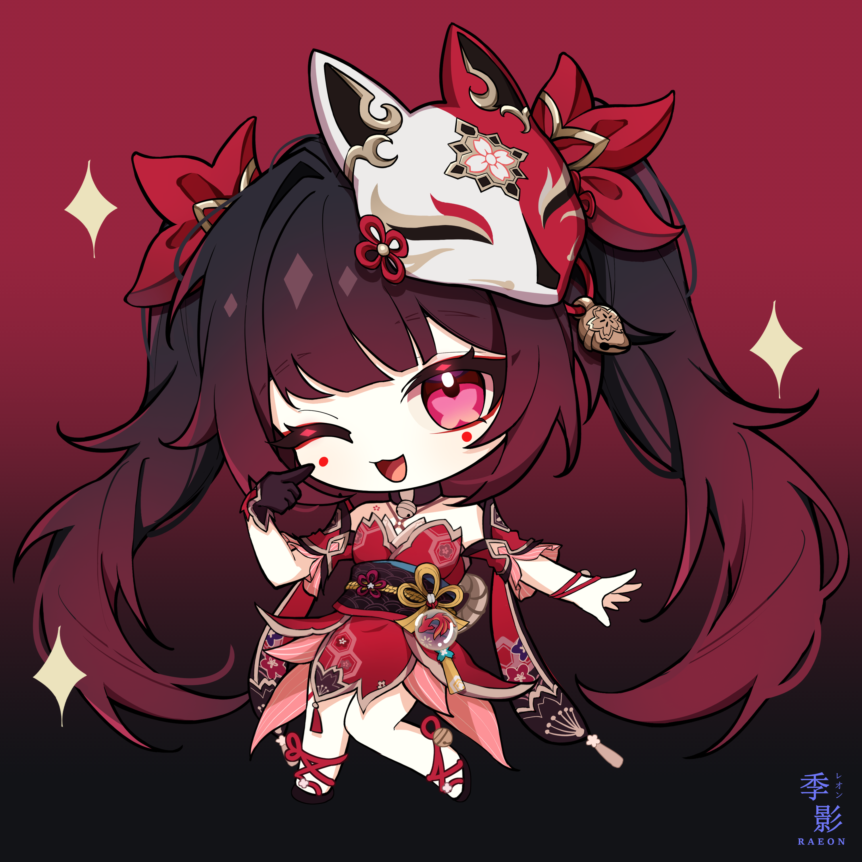 1girl :d absurdres bare_shoulders bell black_background black_choker black_gloves blush bow brown_hair chibi choker criss-cross_halter dress eyeliner finger_to_cheek fox_mask full_body gloves gradient_background gradient_hair hair_bow halterneck highres honkai:_star_rail honkai_(series) long_hair looking_at_viewer makeup mask mask_on_head multicolored_hair neck_bell obi one_eye_closed open_mouth outstretched_arm pelvic_curtain pink_eyes raxa9501 red_background red_bow red_dress red_eyeliner red_hair sandals sash short_dress sidelocks simple_background sleeveless sleeveless_dress smile solo sparkle sparkle_(honkai:_star_rail) twintails very_long_hair