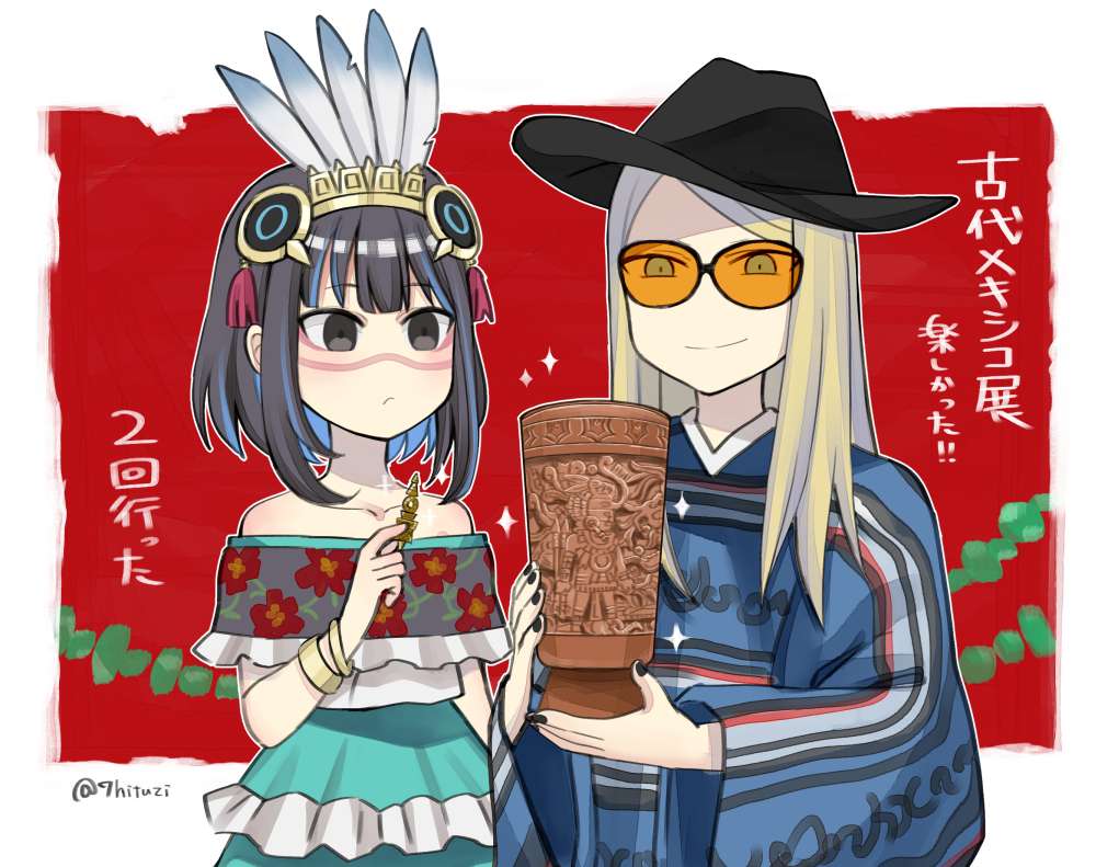 aztec blonde_hair colored_inner_hair erohitu eyeliner facepaint fate/grand_order fate_(series) jewelry makeup mexican_dress multicolored_hair neck_ring poncho tenochtitlan_(ancient_mexico_exhibition)_(fate) tenochtitlan_(fate) tezcatlipoca_(ancient_mexico_exhibition)_(fate) tezcatlipoca_(fate) tinted_eyewear