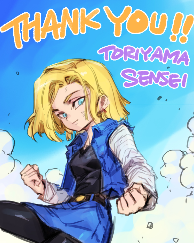 1girl android_18 belt black_belt black_pantyhose black_shirt blonde_hair blue_jacket blue_skirt breasts clenched_hand closed_mouth day dragon_ball dragonball_z green_eyes jacket long_sleeves medium_breasts open_clothes open_jacket pantyhose phantom_cross shirt short_hair skirt smile solo thank_you