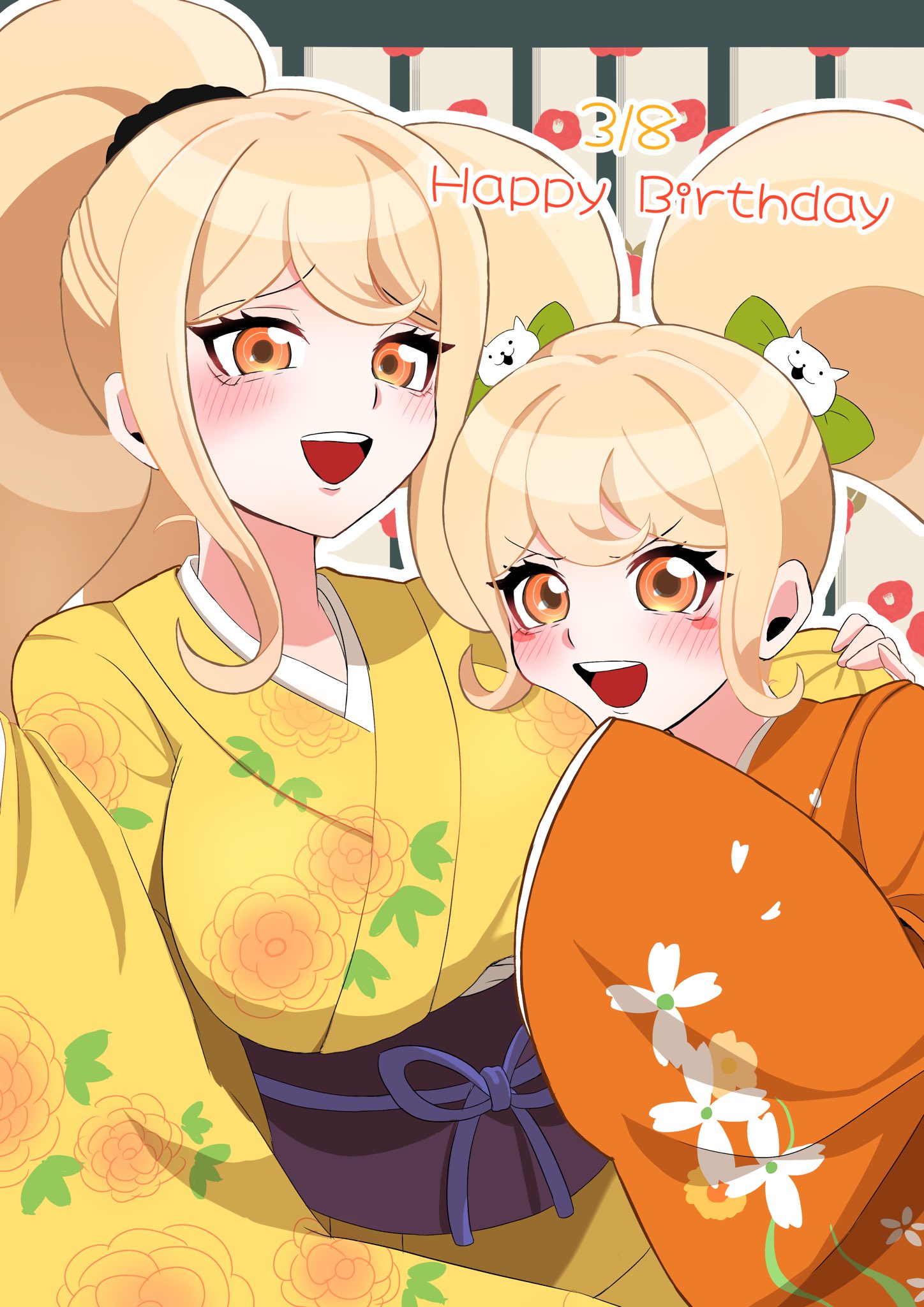 2girls :d black_scrunchie blonde_hair blush breasts danganronpa_(series) danganronpa_2:_goodbye_despair dual_persona hair_ornament hair_scrunchie happy_birthday highres japanese_clothes kimono large_breasts mozuku_(iiiiiiimomo) multiple_girls multiple_views obi open_mouth orange_eyes orange_kimono ponytail saionji_hiyoko sash scrunchie smile teeth twintails upper_body upper_teeth_only yellow_kimono