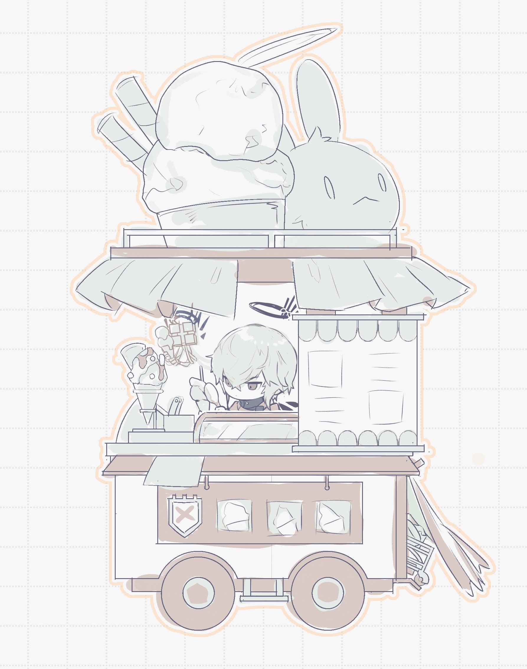 1boy arknights chibi commentary_request cooking executor_(arknights) food food_stand frown grey_hair grid_background halo highres ice_cream ice_cream_stand limited_palette looking_to_the_side male_focus outline parfait red_eyes short_hair simple_background sketch solo spoon vending_cart wasadnt white_background