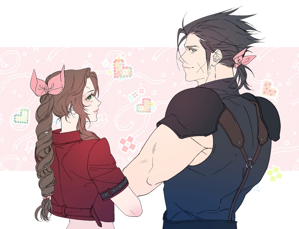 1boy 1girl aerith_gainsborough alternate_hairstyle armor belt black_hair black_shirt blush brown_hair commentary_request cropped_jacket cross_scar crossed_arms curly_hair facial_scar final_fantasy final_fantasy_vii flat_color flower green_eyes hair_ribbon hair_slicked_back hair_tie heart jacket korean_commentary light_smile long_hair looking_back medium_hair muscular muscular_male parted_bangs pauldrons pink_background pink_lips pink_ribbon pixel_heart pixelated polka_dot polka_dot_background ponytail red_jacket ribbon s_sohwagi_s scar scar_on_cheek scar_on_face shirt short_sleeves shoulder_armor sidelocks sleeveless sleeveless_shirt sleeveless_turtleneck standing suspenders turtleneck upper_body zack_fair
