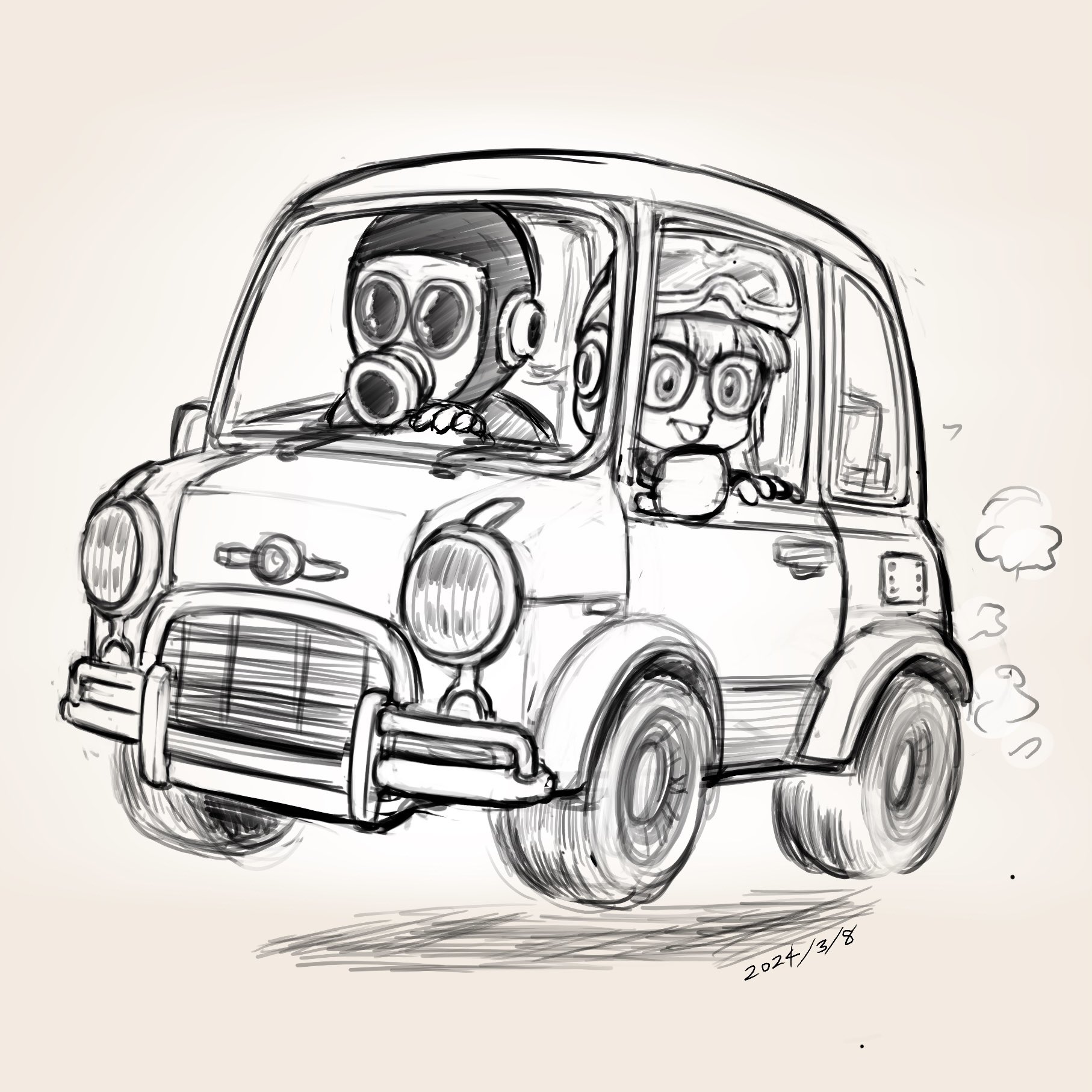 1boy 1girl car commentary_request dated dr._slump driving glass goggles goggles_on_head helmet highres mas_square motor_vehicle norimaki_arale robot simple_background toriyama_akira_(character)