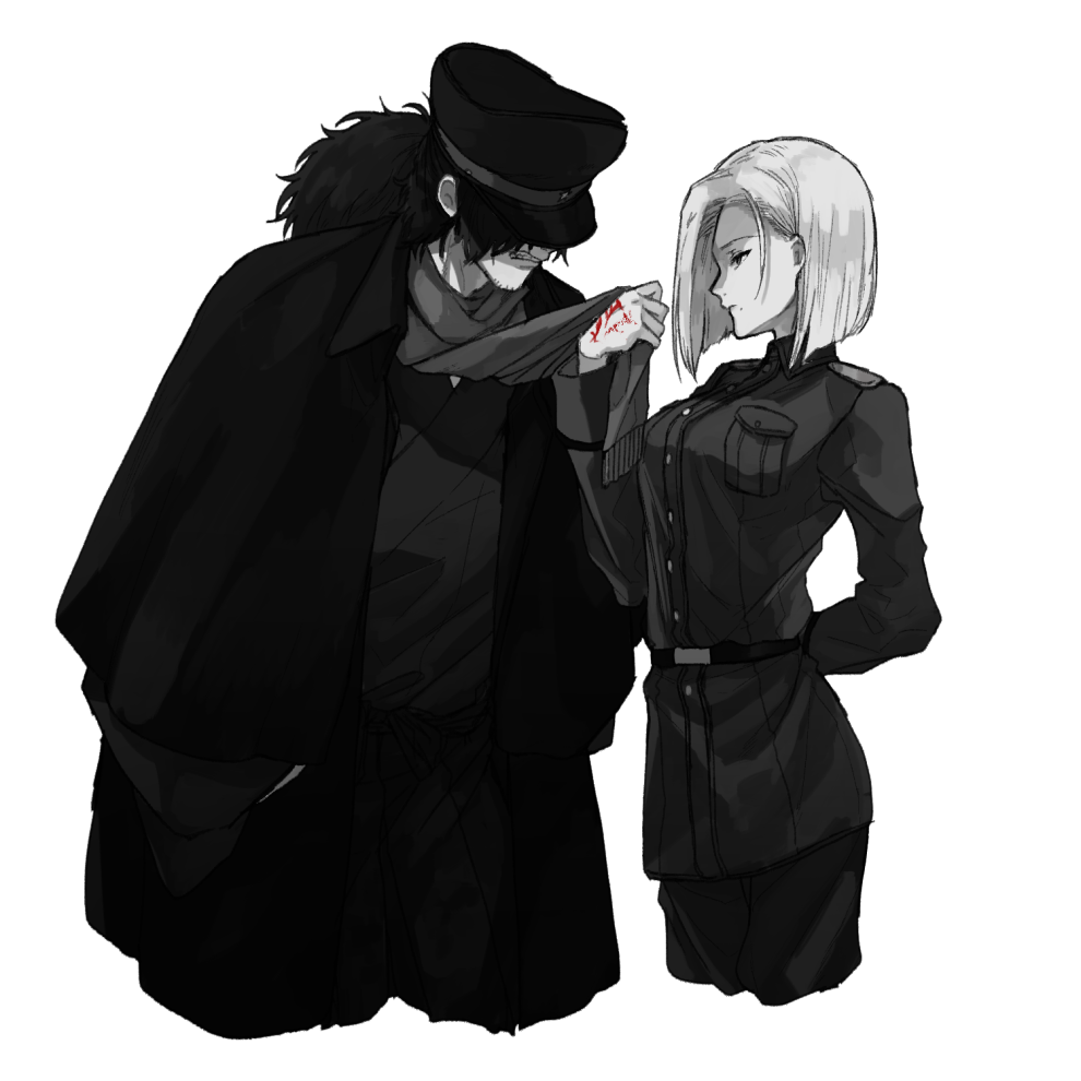 1boy 1girl arm_behind_back assertive_female breast_pocket clenched_teeth clothes_grab command_spell cropped_legs expressionless fate/type_redline fate_(series) greyscale hat japanese_clothes kimono long_sleeves looking_at_another major_reiter military_uniform monochrome neckwear_grab nekoyamiyako okada_izou_(fate) pants pocket ponytail red_theme scarf scarf_grab short_hair simple_background spot_color teeth
