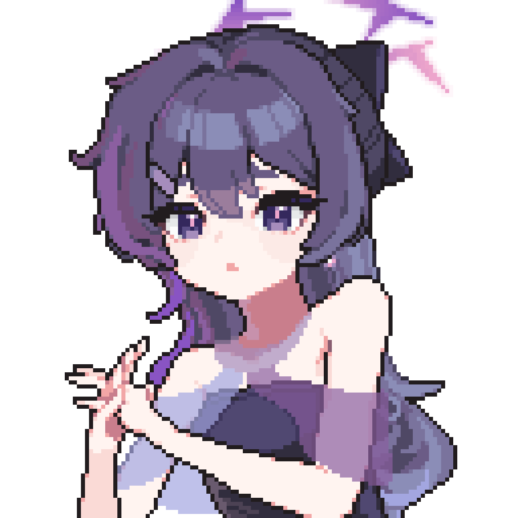 1girl animated animated_gif apieceofpixel bare_shoulders blinking blue_archive blush closed_mouth dress halo hands_on_own_cheeks hands_on_own_face haruka_(blue_archive) haruka_(dress)_(blue_archive) long_hair looking_at_viewer open_mouth pixel_art purple_dress purple_eyes purple_halo simple_background sleeveless sleeveless_dress solo upper_body wavy_mouth white_background