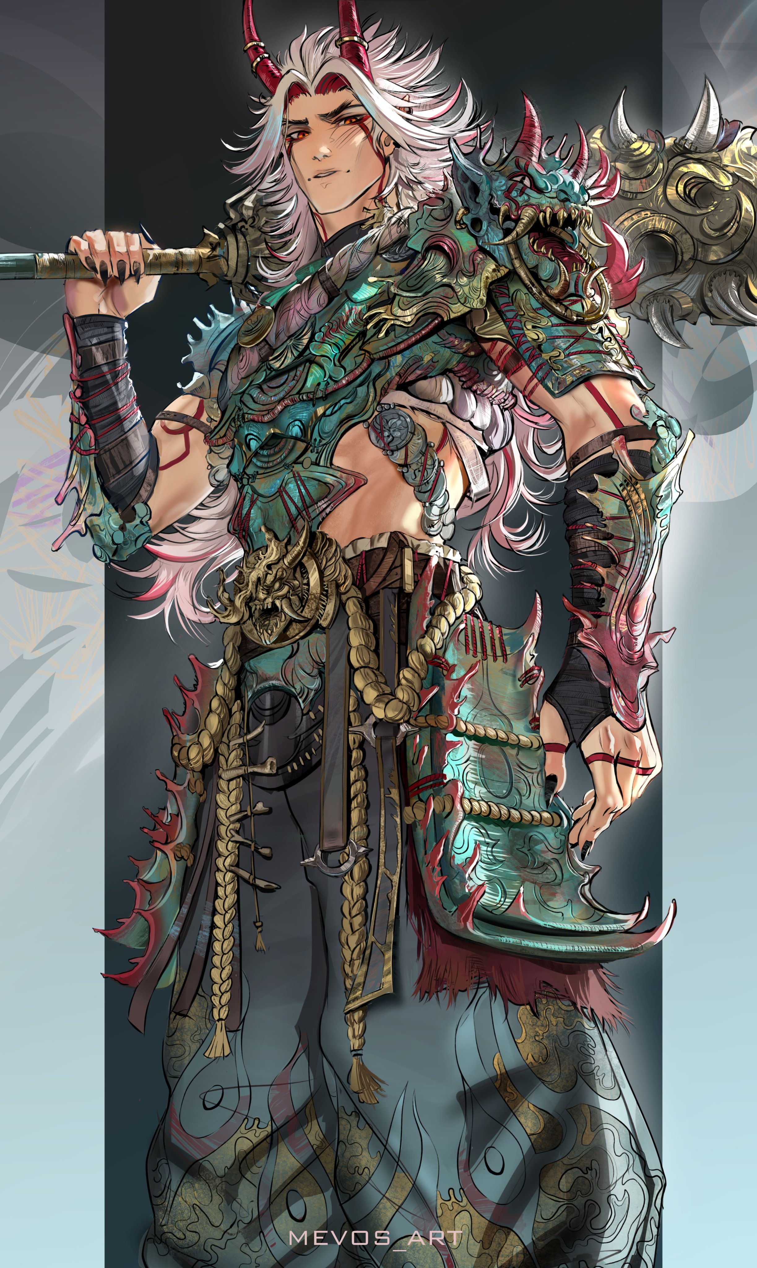 1boy absurdres alternate_costume arataki_itto armor black_nails cowboy_shot demon_horns from_below genshin_impact highres horn_ornament horns long_hair looking_down mace male_focus mevos multicolored_hair orange_eyes over_shoulder pants pauldrons red_hair shoulder_armor solo spiked_mace spikes weapon weapon_over_shoulder white_hair