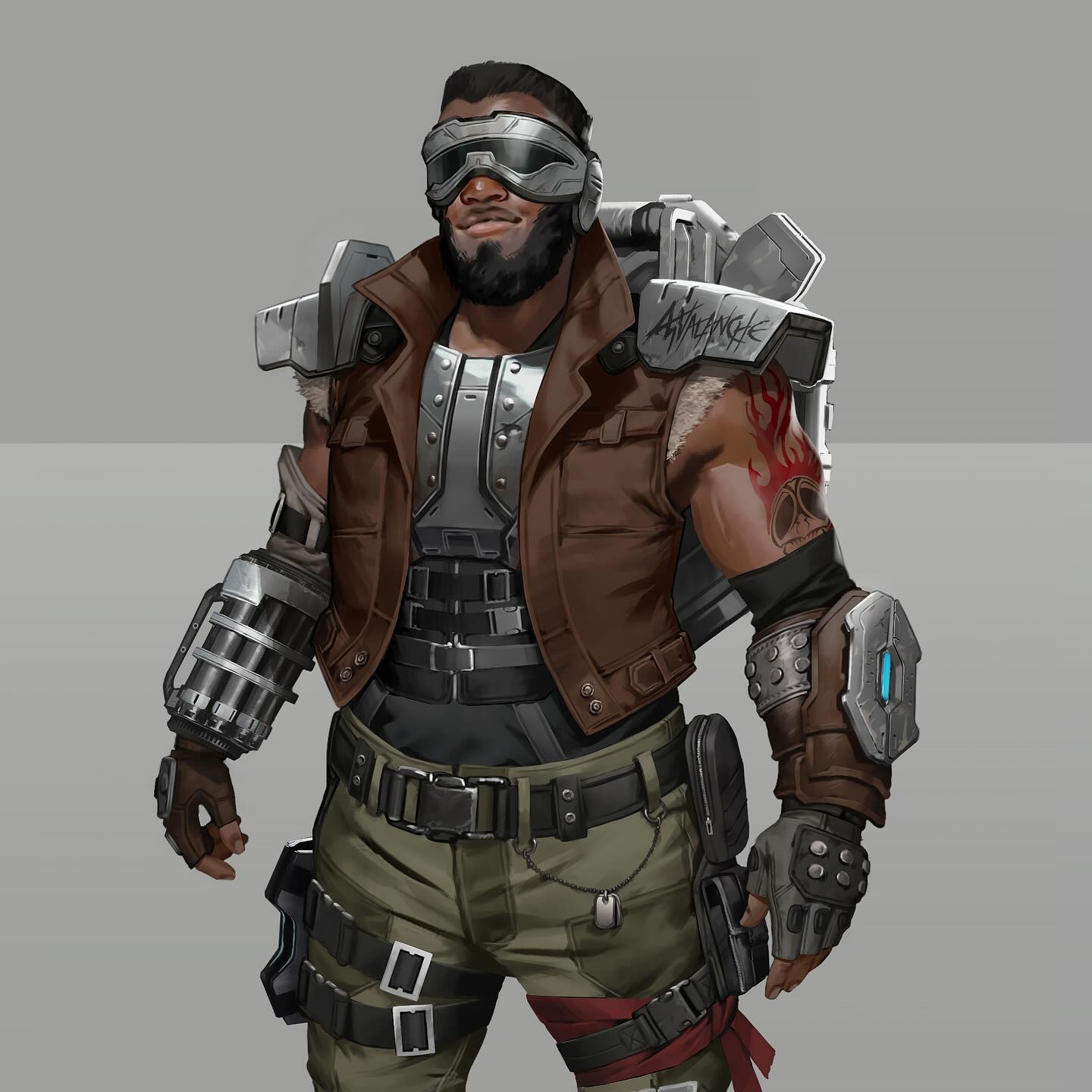 1boy apex_legends arm_tattoo armor asymmetrical_gloves barret_wallace barret_wallace_(cosplay) beard belt black_belt black_hair breastplate brown_gloves brown_vest commentary cosplay cristina_lavina_ferez dark_skin english_commentary facial_hair final_fantasy final_fantasy_vii final_fantasy_vii_rebirth final_fantasy_vii_remake fingerless_gloves flattop gloves green_pants grey_gloves head-mounted_display head_tilt highres male_focus mismatched_gloves newcastle_(apex_legends) official_alternate_costume pants production_art sector_7_savior_newcastle smile solo tattoo thigh_belt thigh_strap vest