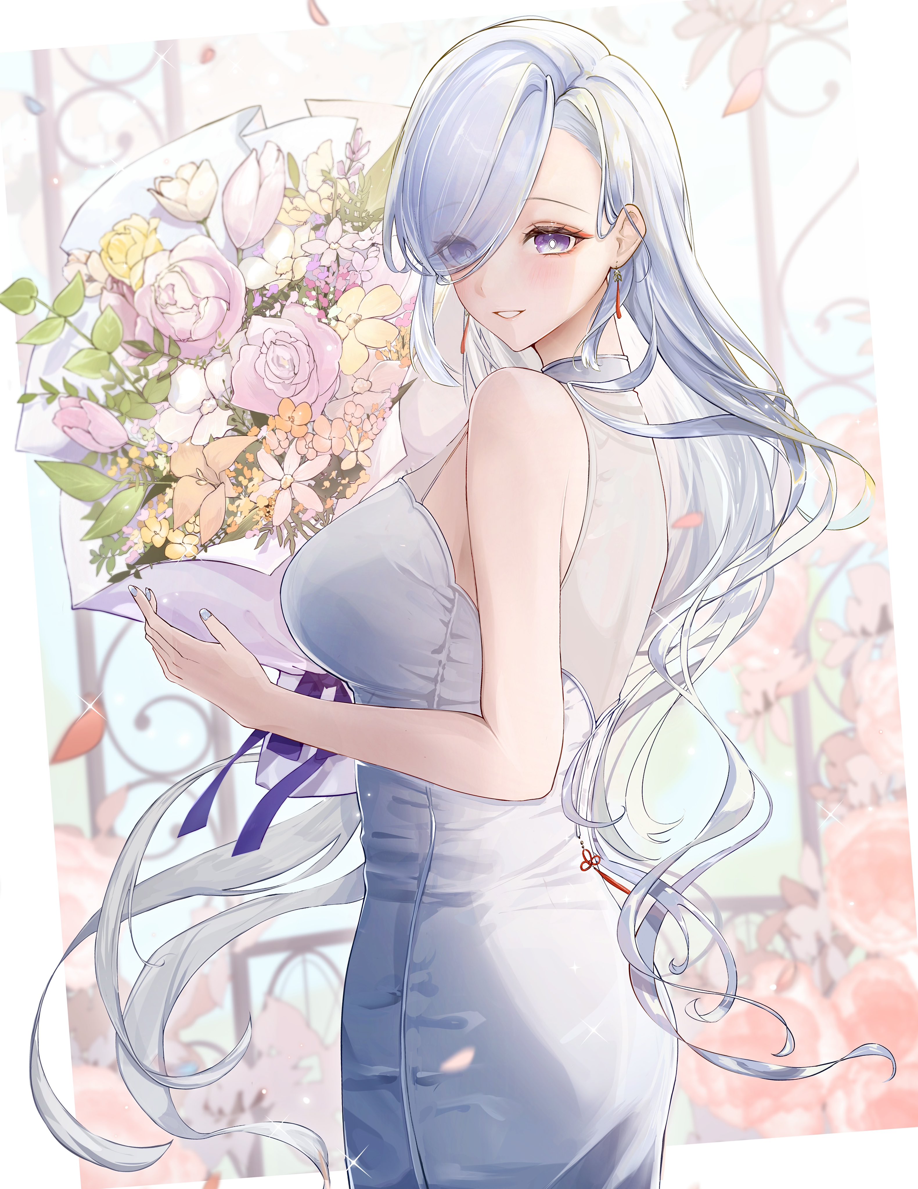 1girl absurdres alternate_costume alternate_hairstyle arano_(waikuni11) asymmetrical_bangs bare_shoulders blush bouquet breasts clenched_teeth cowboy_shot dress eyes_visible_through_hair flower from_side genshin_impact grey_dress grey_hair grey_nails hair_over_one_eye highres holding holding_bouquet large_breasts long_hair looking_at_viewer nail_polish open_mouth pink_flower purple_eyes shenhe_(genshin_impact) sleeveless sleeveless_dress smile solo teeth turning_head