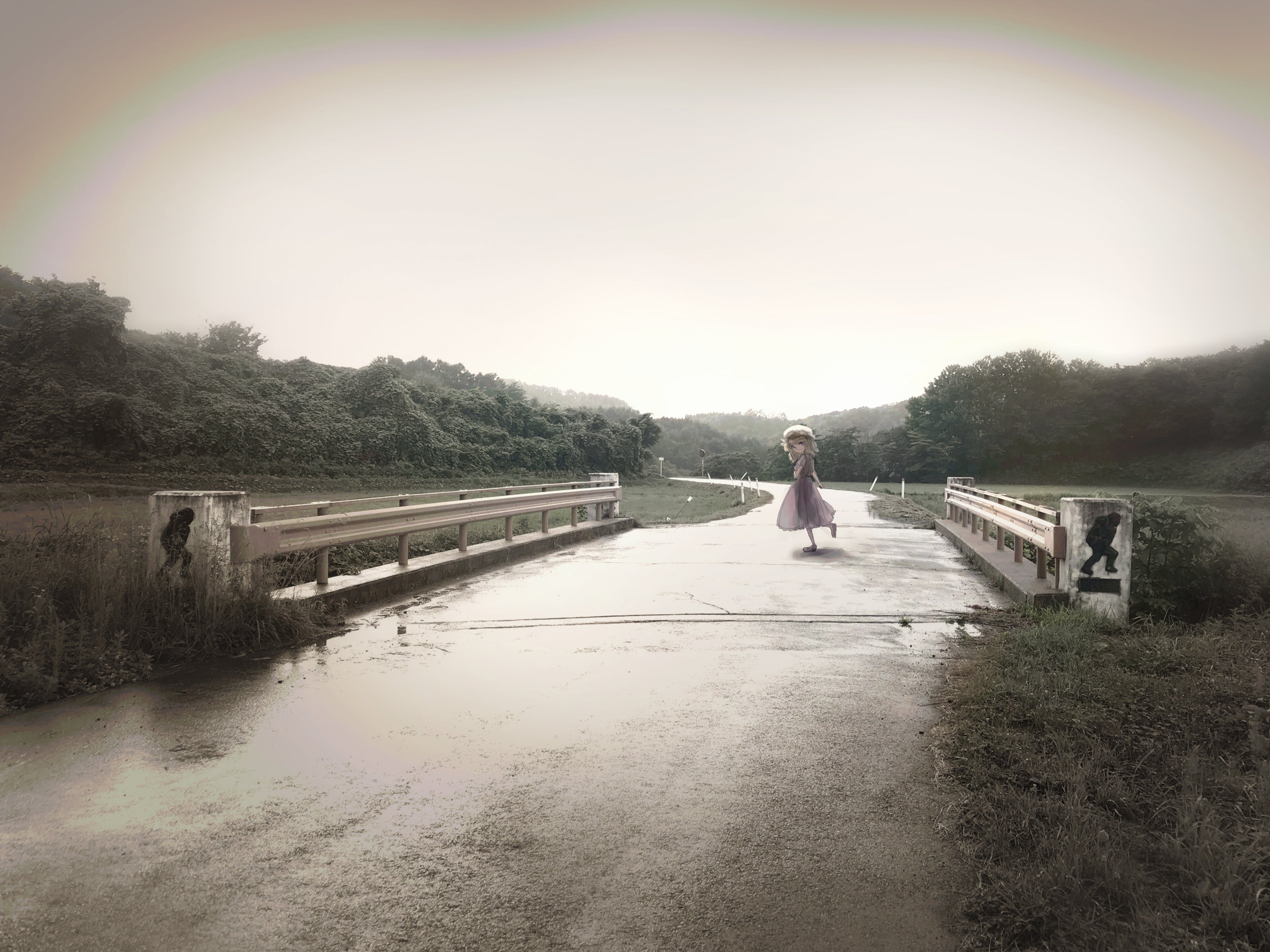 1girl absurdres blonde_hair bridge day dress full_body grass guard_rail hat highres long_dress long_sleeves looking_at_viewer maribel_hearn mary_janes medium_hair mob_cap outdoors purple_dress retro_artstyle scenery see-through_clothes see-through_silhouette shoes touhou tree vignetting white_headwear yatyou
