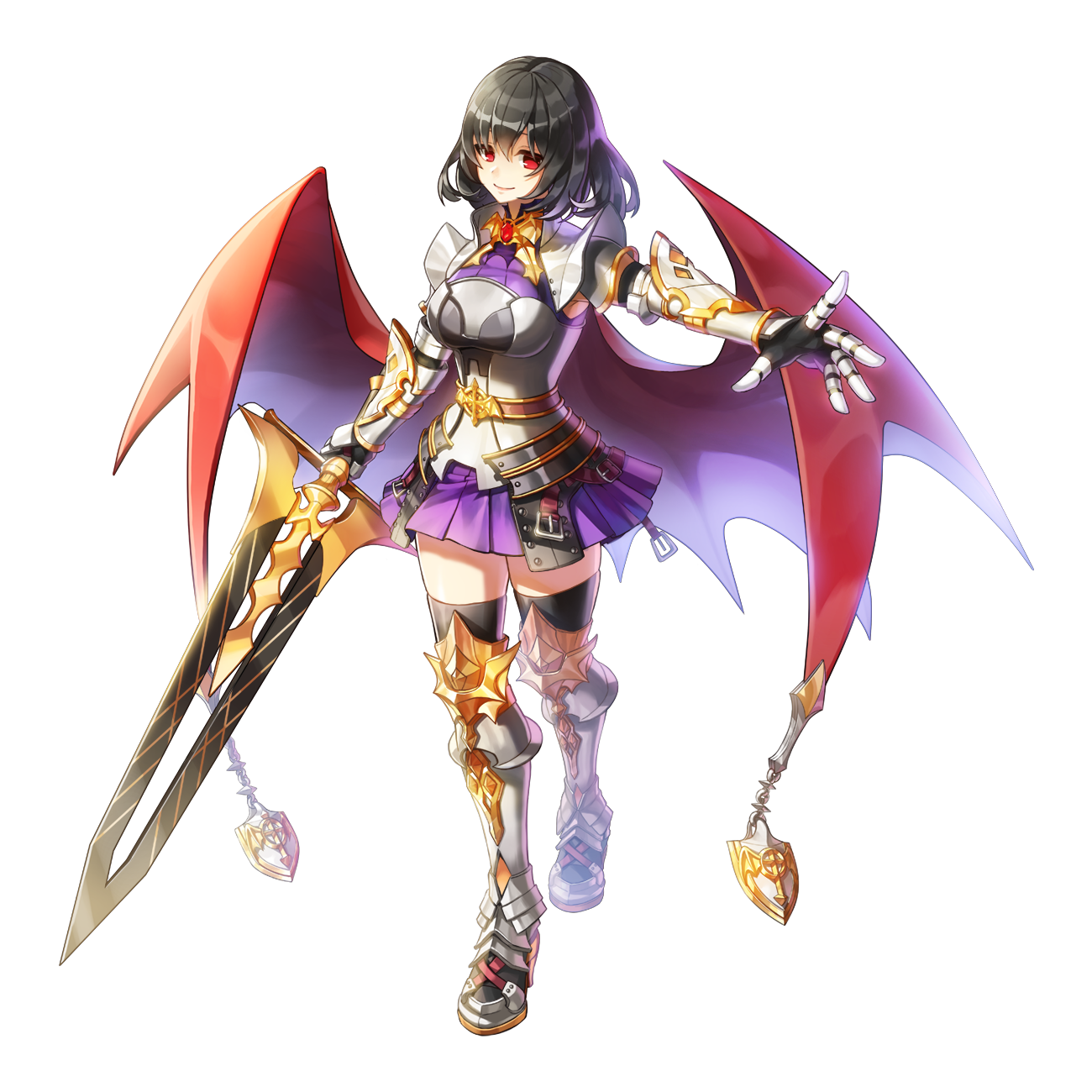1girl armor armored_boots black_gloves black_hair black_thighhighs boots breastplate breasts cape closed_mouth cross dragon_knight_(ragnarok_online) fake_wings full_body gauntlets gloves hair_between_eyes highres holding holding_sword holding_weapon leona_(pixiv) looking_at_viewer medium_breasts medium_hair miniskirt official_art pauldrons purple_shirt purple_skirt ragnarok_online red_cape red_eyes shirt shoulder_armor simple_background skirt smile solo standing sword tabard tachi-e thighhighs transparent_background weapon wings
