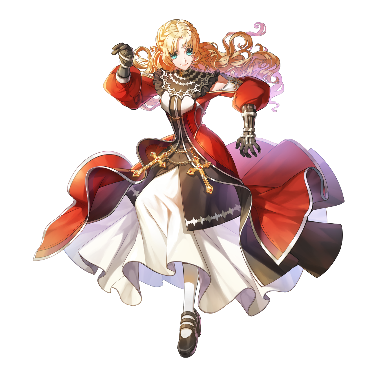1girl arm_up black_gloves black_shirt black_shoes blonde_hair blue_eyes braid breasts closed_mouth clothing_cutout coat cross cross_necklace crown_braid floating_hair frilled_shirt_collar frills full_body gloves highres inquisitor_(ragnarok_online) jewelry leona_(pixiv) long_skirt long_sleeves looking_at_viewer mary_janes necklace official_art puffy_long_sleeves puffy_sleeves ragnarok_online red_coat shirt shoes shoulder_cutout simple_background skirt sleeveless sleeveless_shirt small_breasts smile socks solo tachi-e transparent_background white_skirt white_socks